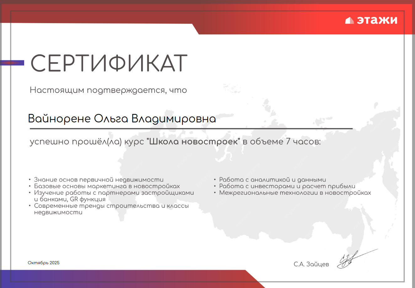 Ольга, мастер своего дела. Выслушала все потребности, задала вопросы от которых пришли к итоговой квартире. Дала свои рекомендации, помогла в согласовании ипотеки. Рекомендую!