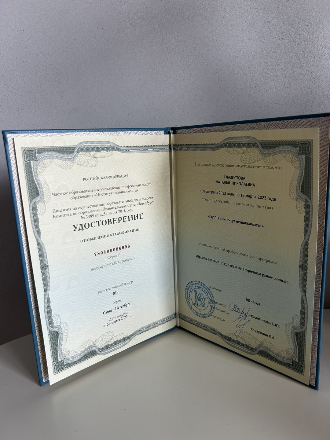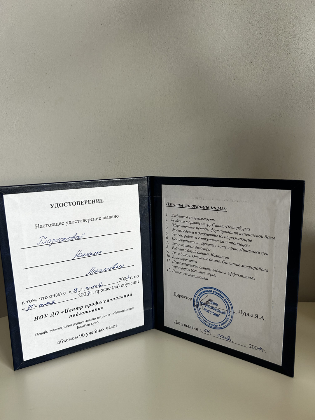 Здравствуйте! Меня зовут Наталья Николаевна, я специалист по недвижимости. С 2006 года помогаю клиентам с любыми вопросами, связанными с недвижимостью в Санкт-Петербурге и Ленинградской области. В 2023 году прошла повышение квалификации в «ЧОУ Институт Недвижимости» в Санкт-Петербурге. Я являюсь брокером-экспертом по сделкам как на вторичном, так и на первичном рынке жилья. Буду рада помочь вам!