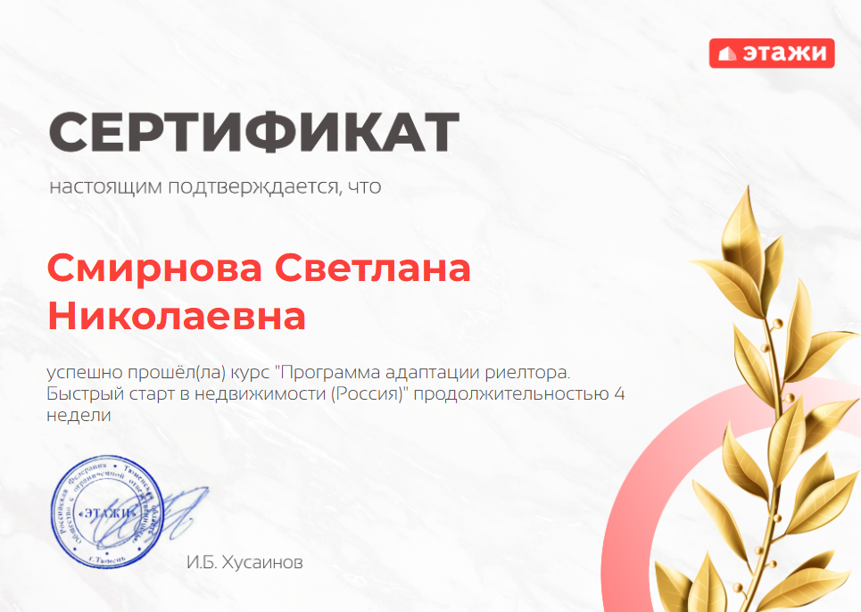 Рекомендую! Хочу выразить огромную благодарность риэлтору Смирновой Светлане! Компетентный специалист, проделала огромную работу для заключения и подготовки нашей сделки, всегда на связи, четко и понятно ответит на все интересующие вопросы. Нам очень повезло, что нашу сделку вела именно Светлана!