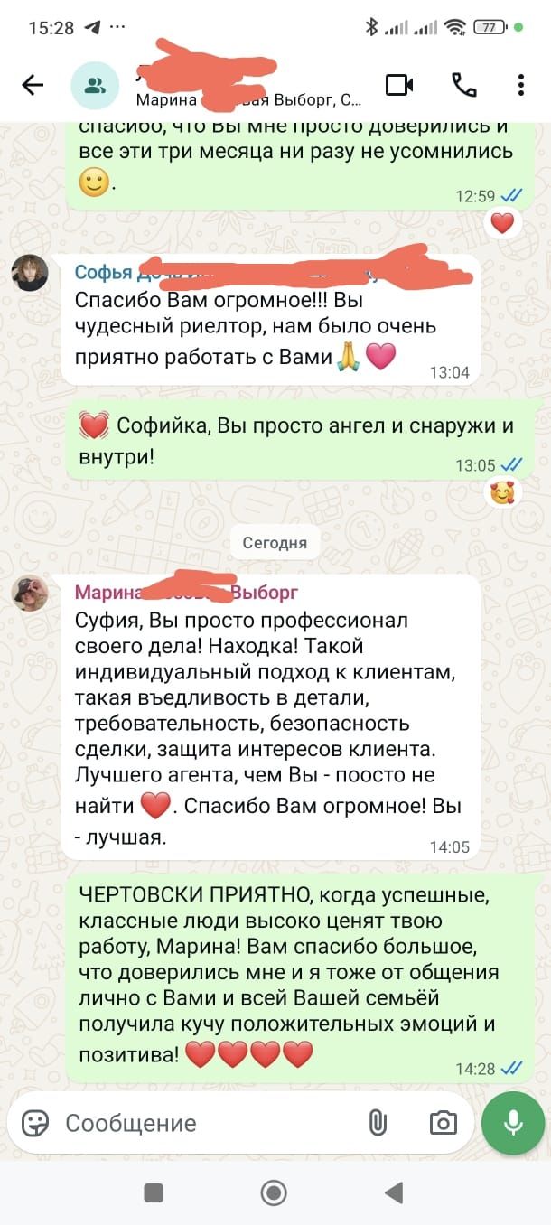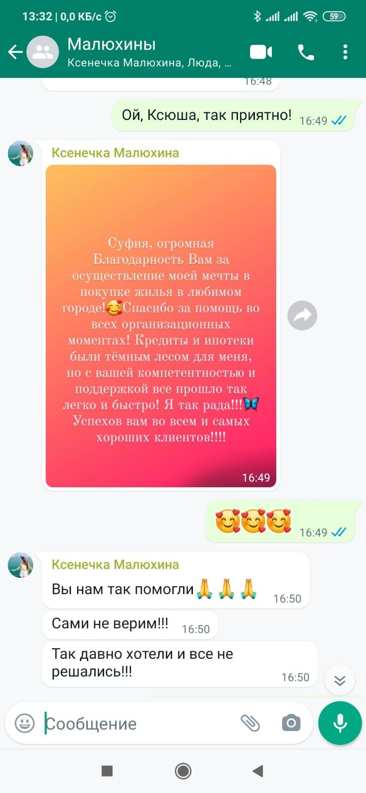 Купили с Суфией 2 квартиры. С начала поиска квартиры до оформления сделки Суфия находилась постоянно на связи. Она сама созванивалась с продавцами, договаривалась о просмотрах, запрашивала и проверяла все документы. Полное сопровождение покупки квартиры. Спасибо, Суфия! Вы лучшая!