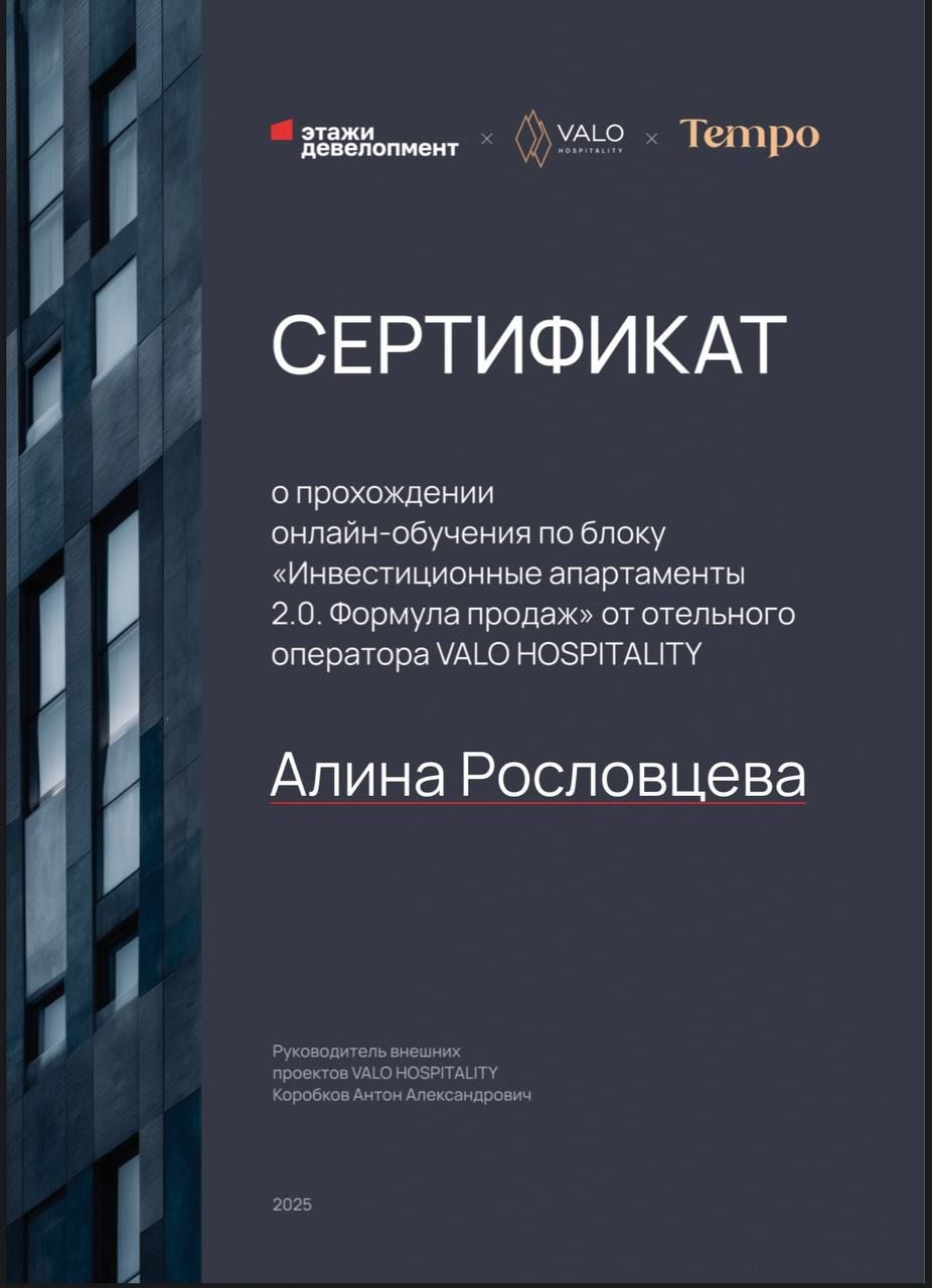 Хочу выразить огромную благодарность Алине за профессиональную работу и помощь в приобретении студии! Сделка прошла быстро, все вопросы решались оперативно и грамотно. Алина был всегда на связи, давала подробные консультации, помогала с выбором и оформлением документов. Благодаря Алине покупка жилья прошла легко и без стресса. Очень доволен результатом, обязательно буду рекомендовать вас друзьям...