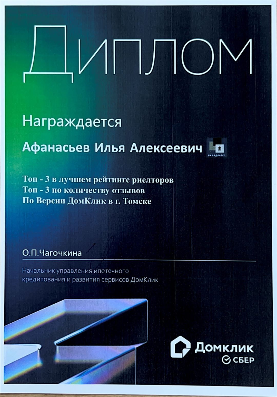 Хочу выразить огромную благодарность Афанасьеву Илье Алексеевичу за быструю и профессиональную работу!Сделка прошла без лишних хлопот,Илья всегда был на связи отвечал на все вопросы и давал ценные советы.Рекомендую всем,кто ищет надёжного специалиста!