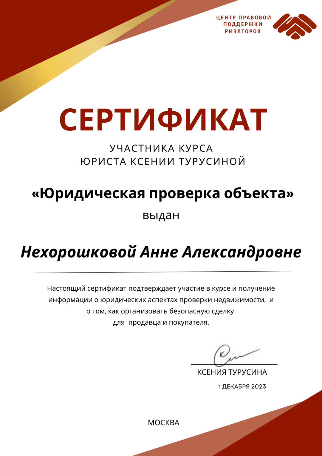 Обратились к Анне по рекомендации. Помогла одобрить ипотеку, подобрать квартиру, юридически все проверила и подготовила документы. На всех этапах консультировала и помогала во всех вопросах! Спасибо!