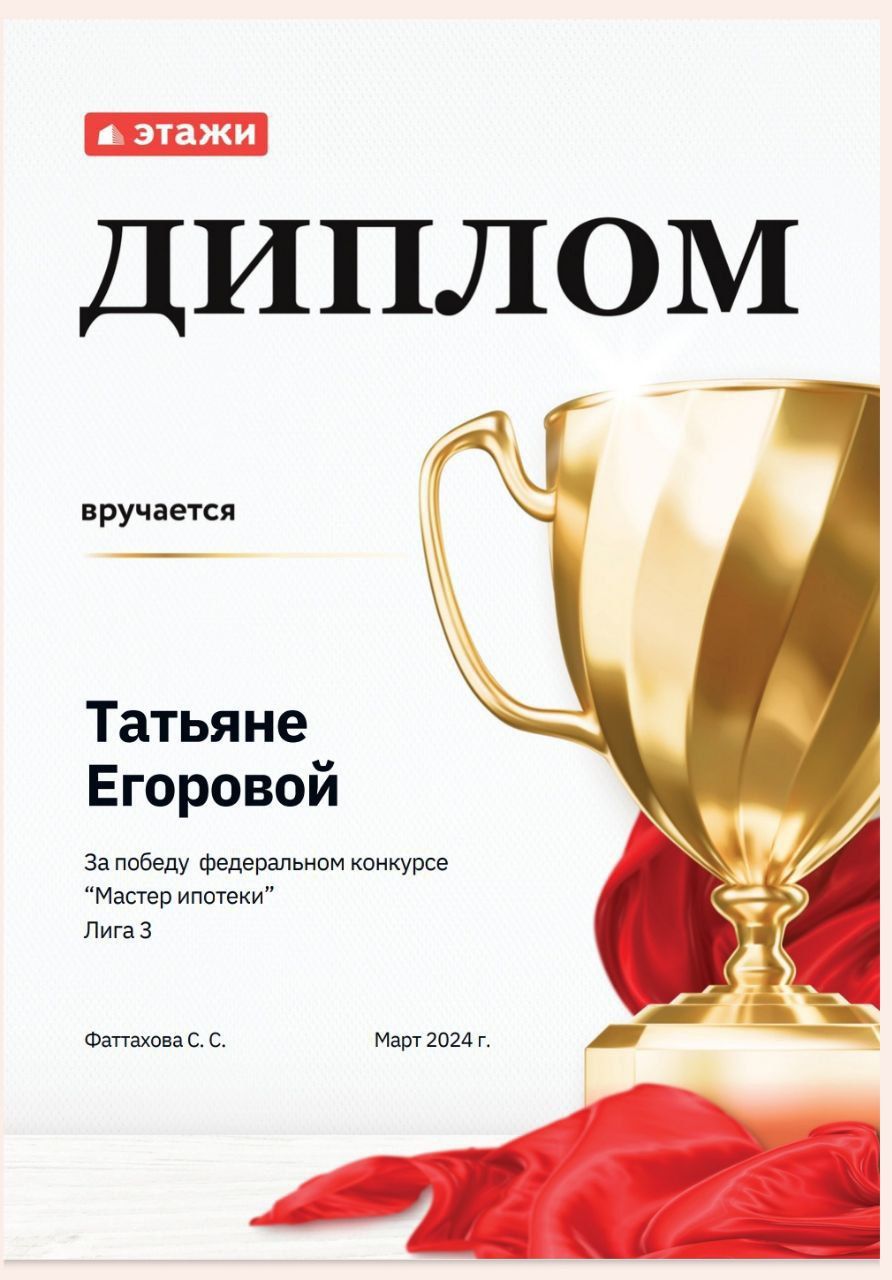 Хочу выразить благодарность Егоровой Татьяне Олеговна. Рад, что обратился к профессионалу своего дела. Огромное спасибо за оформление всех документов и грамотное проведение сделки. Татьяна Олеговна была всегда на связи со мной, если у меня возникали вопросы. Все вопросы решались оперативно, сделка прошла качественно в короткие сроки. Поэтому в следующий раз, надеюсь еще будет возможность,...