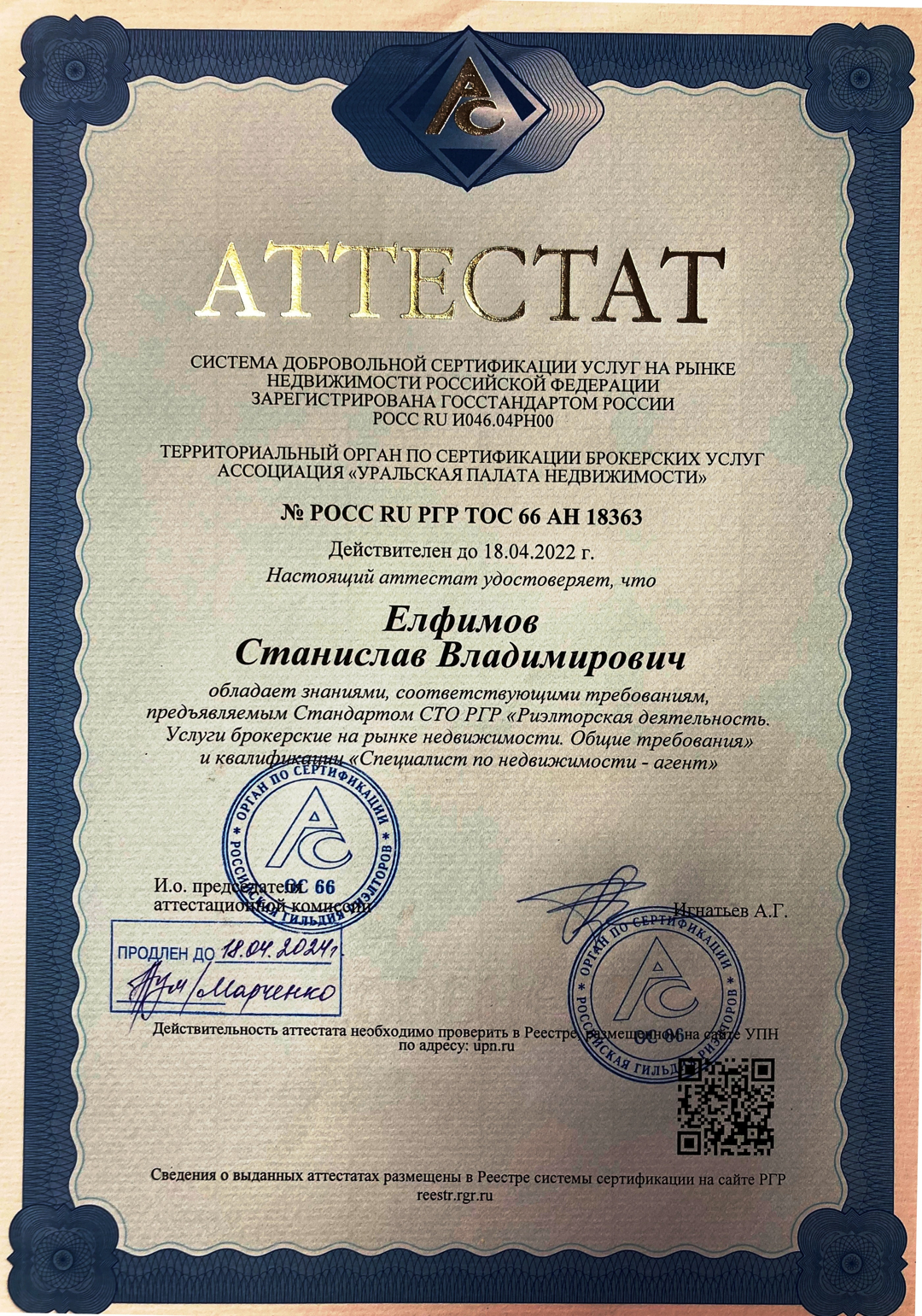 Опыт работы на рынке недвижимости с 2001 года. Специалист Компании со дня основания, 2004 г. В рамках внутрикорпоративных званий за отличные результаты в работе удостоен звания "Золотой маклер", 2007 г. Аттестат: №РОСС RU РГР ТОС 66 АН 18363. Срок действия: 18.04.2024 г.