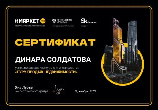 Наша сделка прошла максимально чисто и прозрачно! После первой встречи не осталось вопросов о компетентности Динары и мы с удовольствием решили с ней работать! Сопровождение 24/7, всё расскажет, объяснит, скоординирует! Только положительные эмоции вызывает и сам человек и профессионализм!
