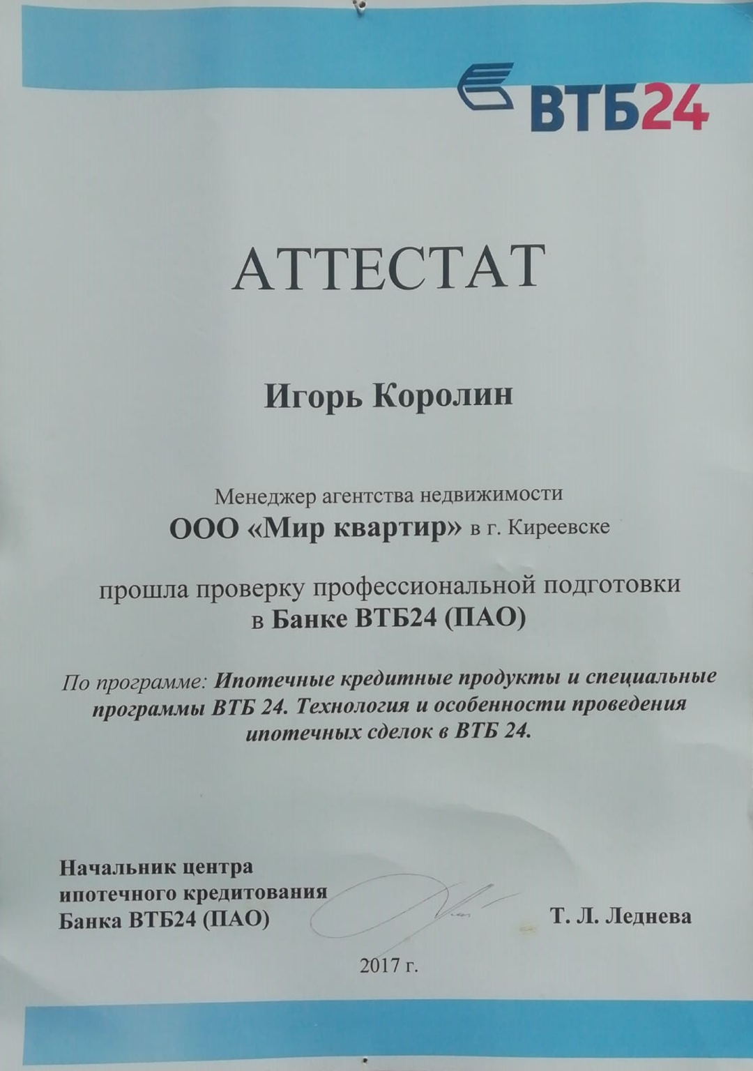Выражаю благодарность Королину Игорю за профессионализм, ответственность, качественный и тактичный подход в работе с клиентами. В процессе работы по сбору и оформлению документов, выбору квартиры он проявил себя как грамотный, высококвалифицированный специалист.