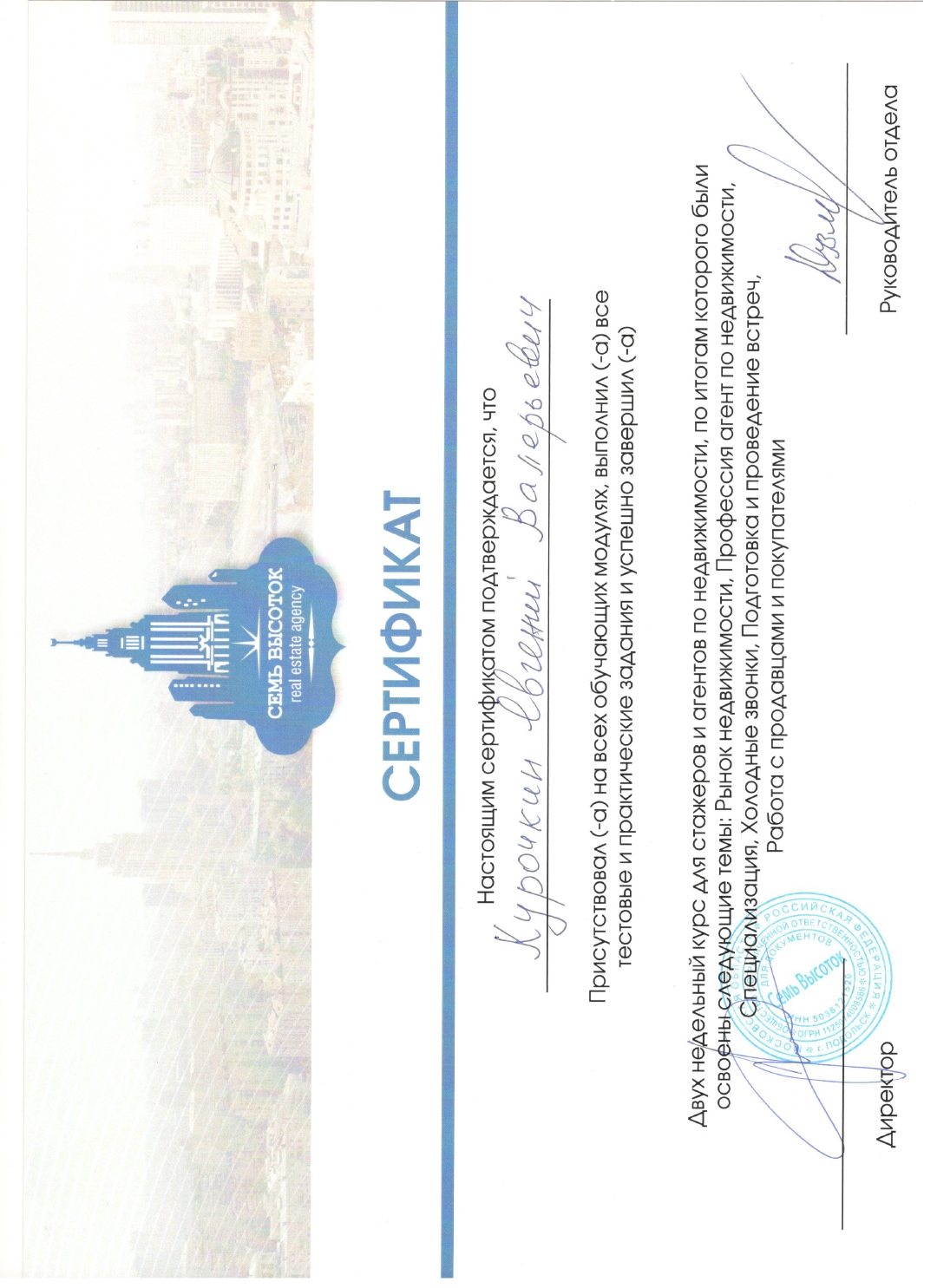 Оказывая услуги клиентам, мы понимаем что люди доверяют нам одну из самых больших ценностей - свой дом. Поэтому в своей деятельности мы сочетаем инновации, ответственность и человеческое отношение к каждому клиенту. Компания активно развивается, инвестирует в обучение, систематизирует бизнес процессы и каждый день улучшает качество услуг. Мы строим отношения с ведущими банками, страховыми...
