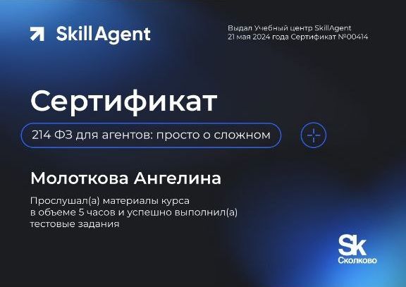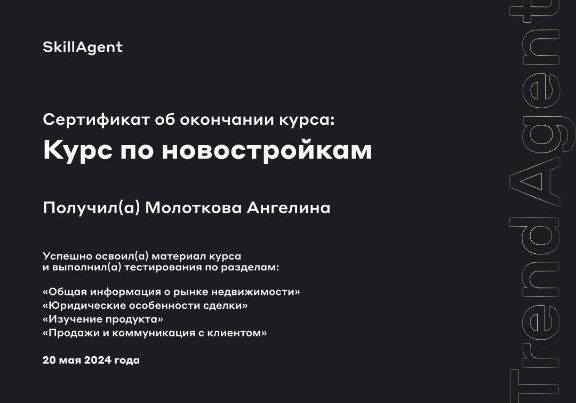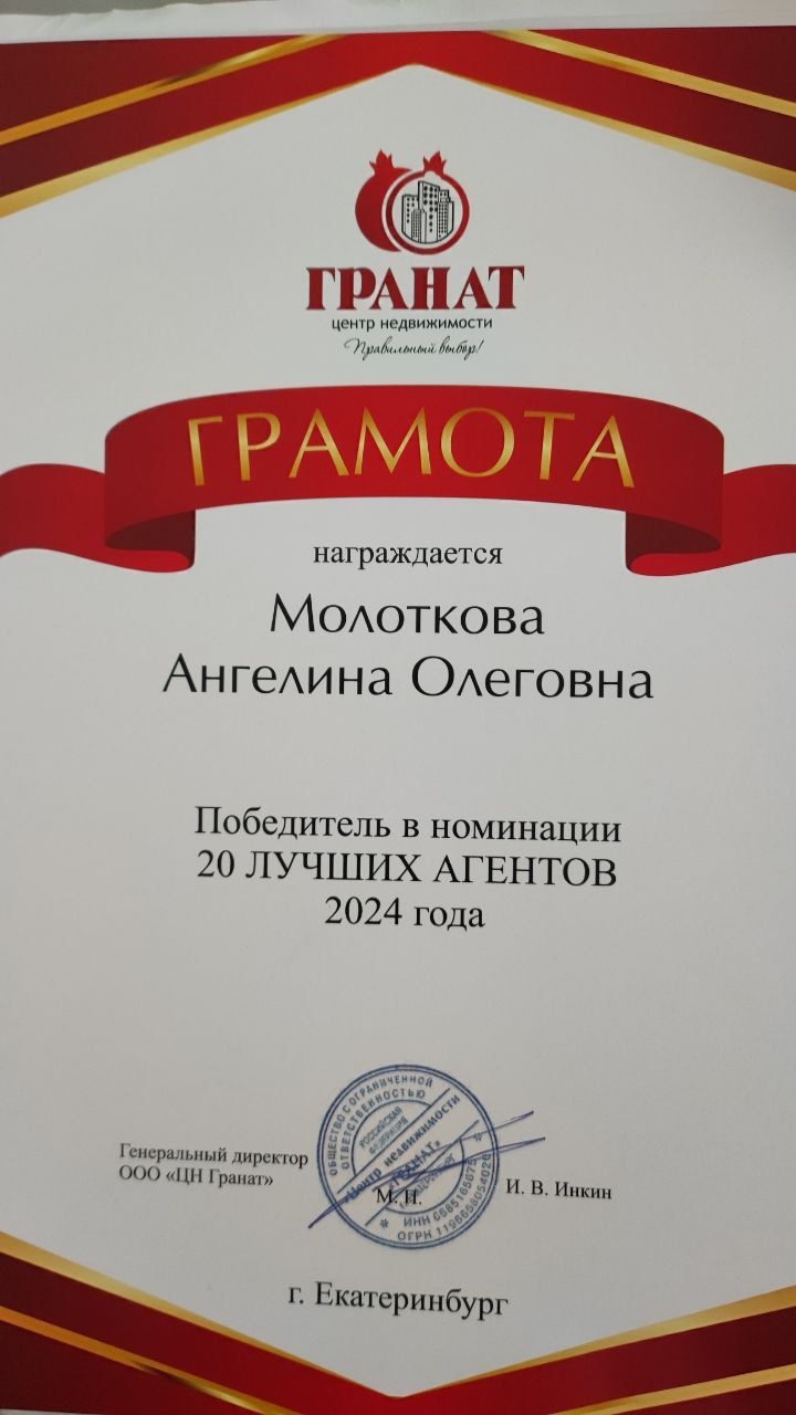 Благодарю Ангелину Молоткову за помощь в проведении сделки! С ее помощью, у меня всё прошло максимально четко, профессионально и доброжелательно! Особенно ценно то, что Ангелина не пожалела своего времени и сил на подробное, многократное объяснение тех моментов, которые казались мне непонятными и сложными. Всё было «разложено по полочкам», и я легко доверила этому грамотному специалисту,...