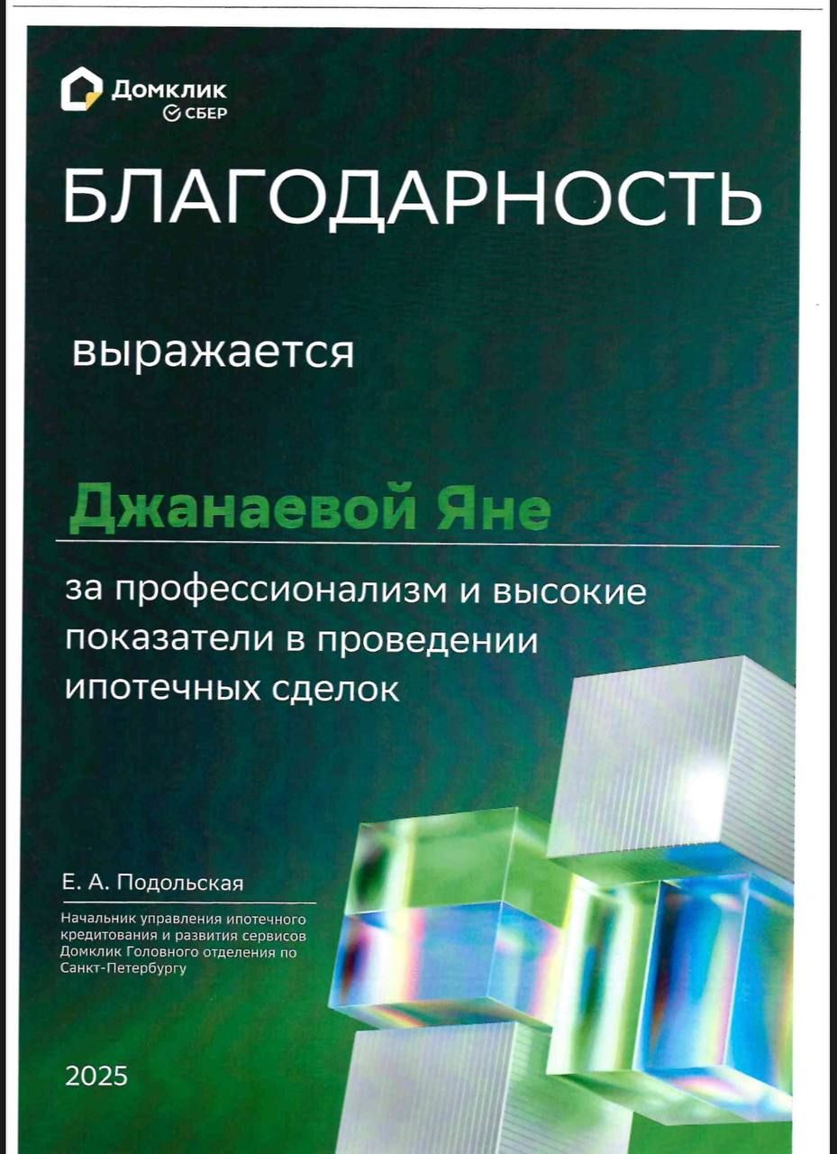 Здравствуйте! Я Яна, Ваш ипотечный брокер, и я здесь для того, чтобы сделать процесс получения ипотеки простым и понятным. Моя работа — это не просто цифры и документы, а помощь вам в осуществлении одной из самых важных покупок в жизни.