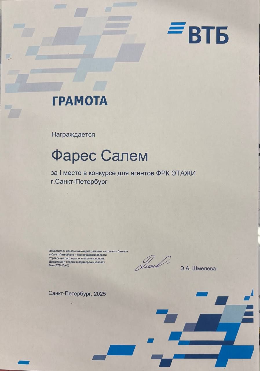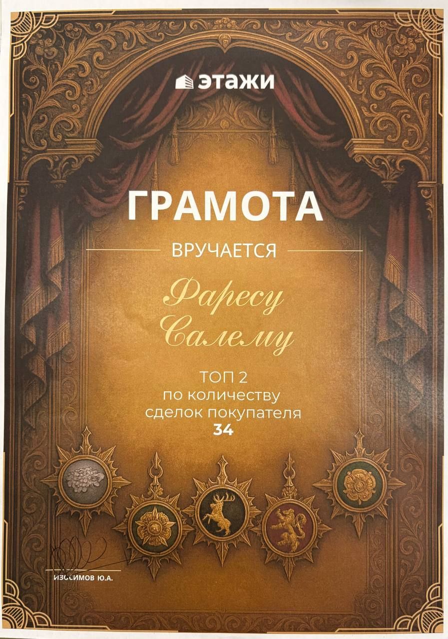Хочу сказать огромную благодарность моему риелтору Салему за его профессиональный отличное работу сопровождение сделки. Помог с покупкой участка со строительством! В процессе работы он оперативно решал все возникающие вопросы и держал меня в курсе каждого шага, что было очень важно. Особенно хочу отметить его внимательность к деталям и умение находить оптимальные решения, даже в сложных...