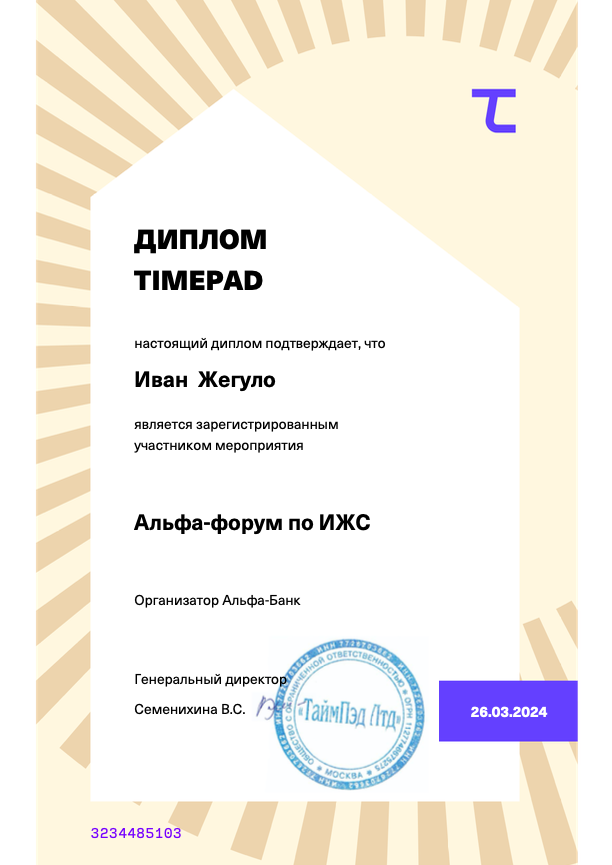 Хочу оставить свой отзыв,тем самым выразить свою благодарность Жегуло Ивану Дмитриевичу за отлично проделанную работу и помощь в получении ипотечного решения. Благодаря ему мы нашли отличный вариант по отличной цене. Иван Дмитриевич всегда был на связи