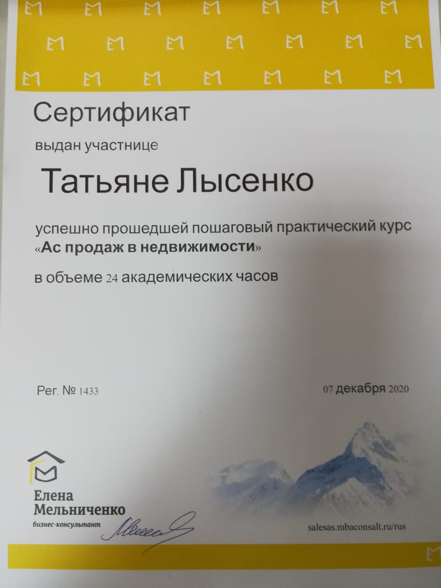 Выражаю огромную благодарность риелтору Лысенко Татьяне Викторовне, за её чуткость и профессиональную грамотность! Услугами данного специалиста и компании в целом я воспользовалась впервые, о чём ни разу не пожалела. Буду рекомендовать Татьяну всем своим знакомым, желающим приобрести недвижимость.