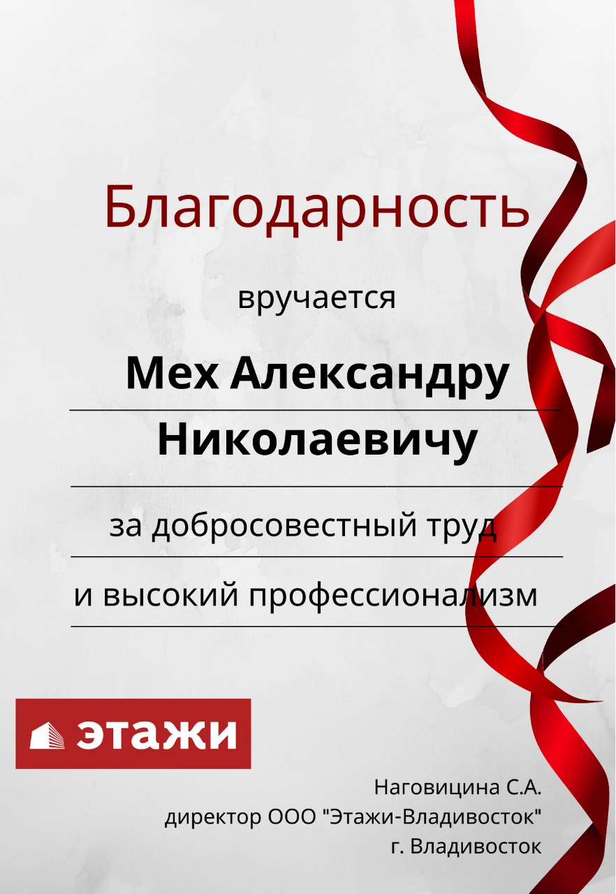 Впервые приобретали недвижимость в г.Владивосток ,выбрали агентство Этажи и хочу оставить положительный отзыв о вашей работе.Александр Мех,оперативно проводил показ квартир,учитывая наши пожелания,давал консультацию,находился с нами на связи в любое время,до позднего вечера и в выходные дни .Четко,профессионально,грамотно сопровождал нас до сделки .Спасибо Вам огромное за Вашу работу!