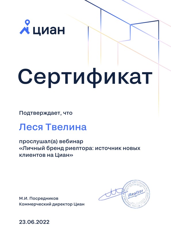 Благодарю Лесю Твелину за компетентность, оперативность и отзывчивость! Моя квартира была продана в кратчайшие сроки. Сделка прошла легко и быстро, а главное - безопасно. Леся, спасибо!🤗