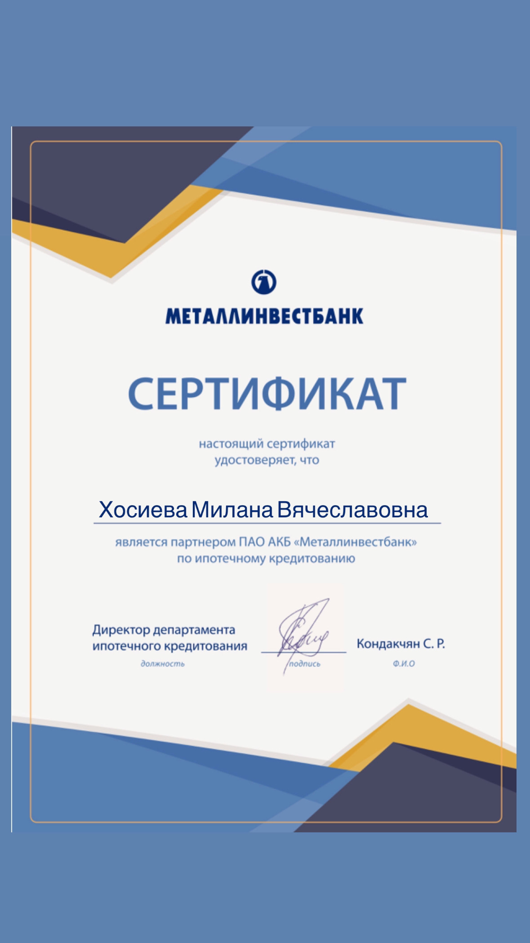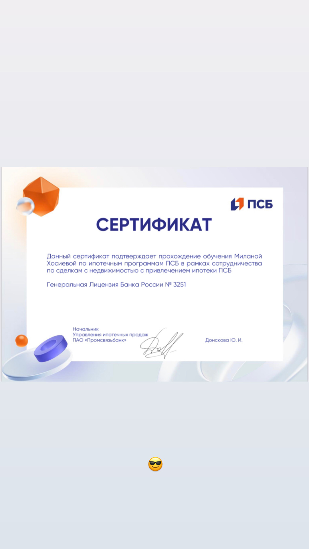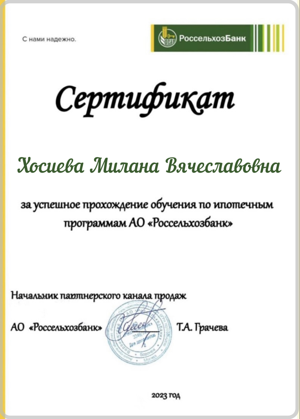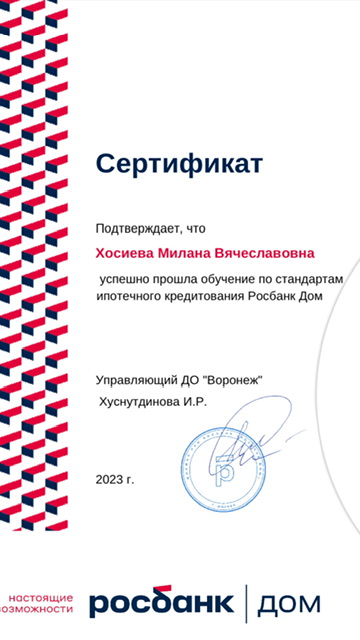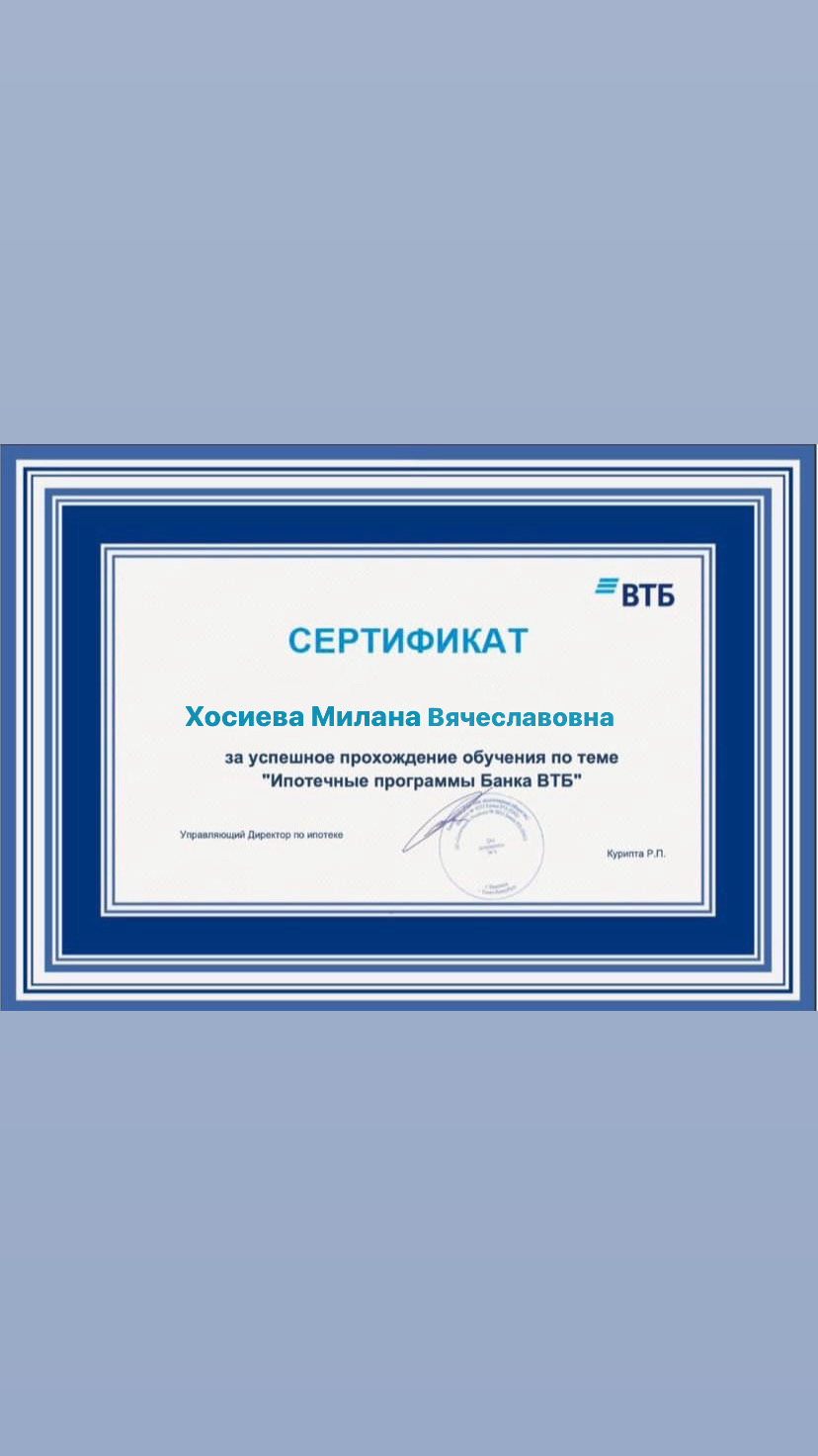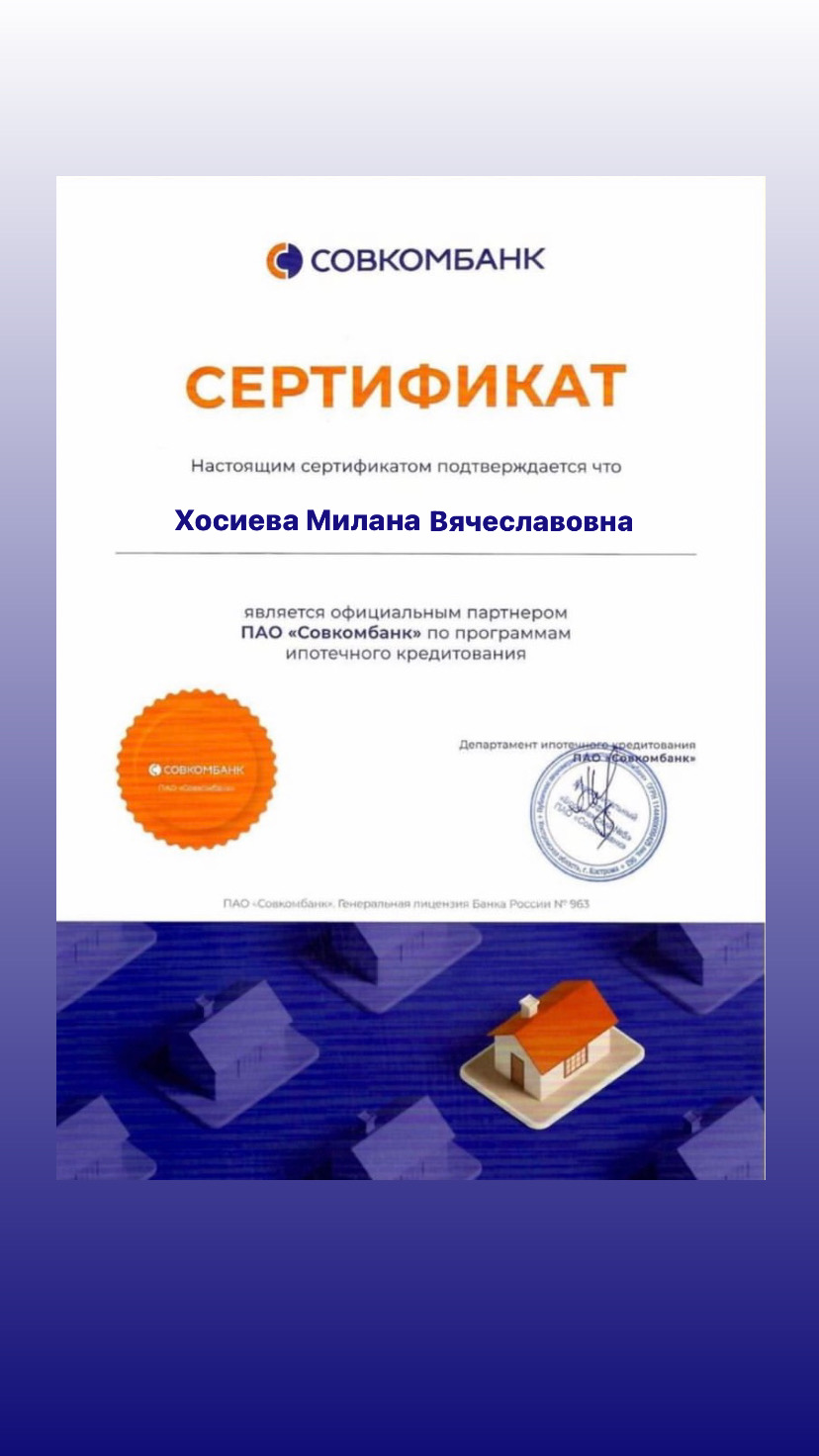 Выражаю благодарность специалисту Хосиевой Милане Вячеславовне за сопровождение сделки по покупке квартиры.Очень внимательный, грамотный и ответственный специалист и замечательный, порядочный человек.Приятно было иметь дело.Огромное спасибо.