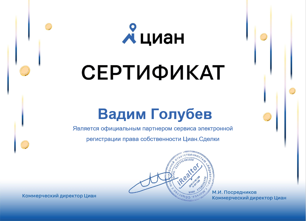 Вадим - прекрасный риэлтор! Благодаря его работе, легко нашел подходящую мне квартиру. Так же хочу отметить быструю подготовку документов перед сделкой и оперативные ответы на все вопросы.