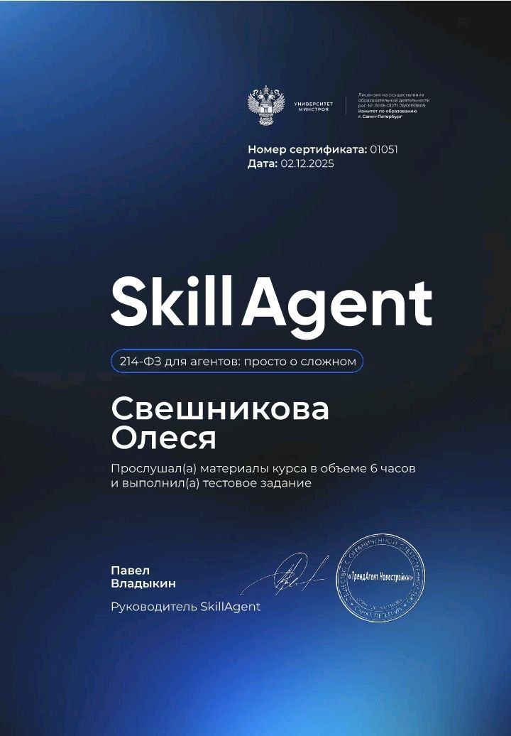 Высшее юридическое образование. Опыт работы в недвижимости более 16 лет. Работаю со всеми федеральными застройщиками напрямую без комиссии для покупателя. Помощь в сопровождении сделок с недвижимостью любой сложности.