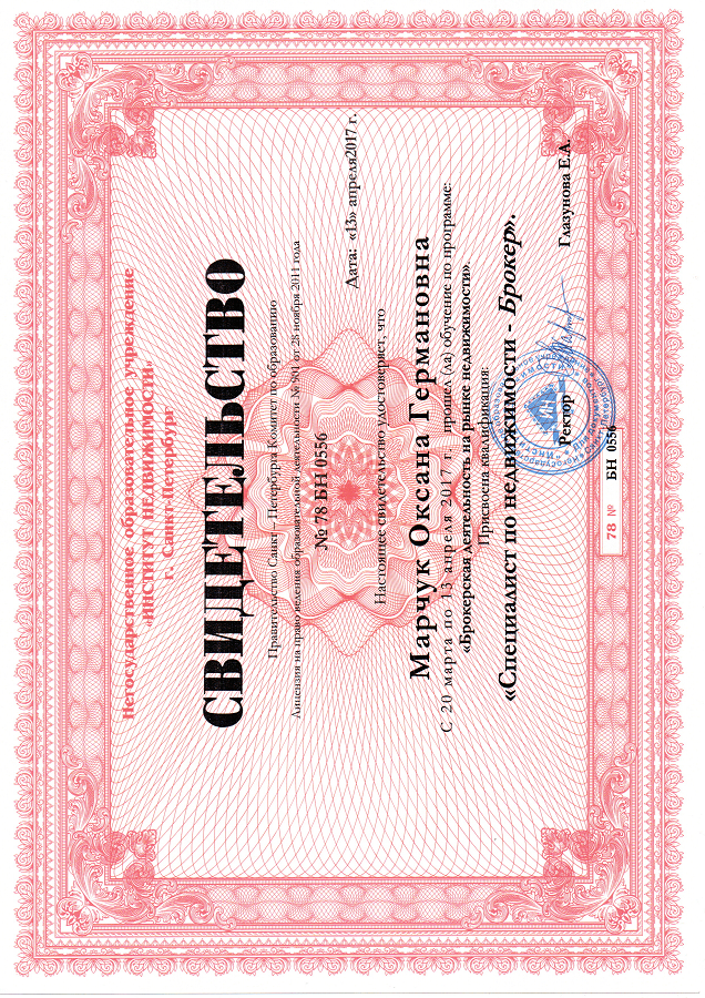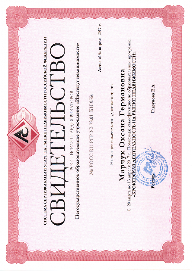 Хочу поблагодарить риэлтора Марчук Оксану Германовну, за проделанную работу в организации покупки квартиры. Огромное спасибо за оформление всех сопутствующих документов и грамотно проведенные сделки. Оксана очень ответственный, отзывчивый и профессиональный человек своего дела. Спасибо Вам!