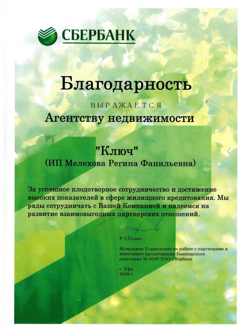 Спасибо огромное за проделанную работу, ваше агентство самое лучшее. Отдельная благодарность вашему директору Мелеховой Реине Фанилевне. Я очень рада, что оформление мне провели такие грамотные специалисты. Просто профи своего дела! Всем всем рекомендую агентство недвижимости КЛЮЧ. СПАСИБО ЕЩЕ РАЗ!!!