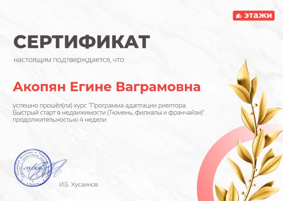 Хочу выразить огромную благодарность специалисту Акопян Егине, которая помогла провести сделку максимально комфортно, во всем помогла и онлайн я стала обладателем квартиры в Екатеринбурге 😍 Егине - это риелтор, которому можно довериться на все 100%, я даже не предполагала, что сделка может пройти так просто и без лишней суеты 🔥