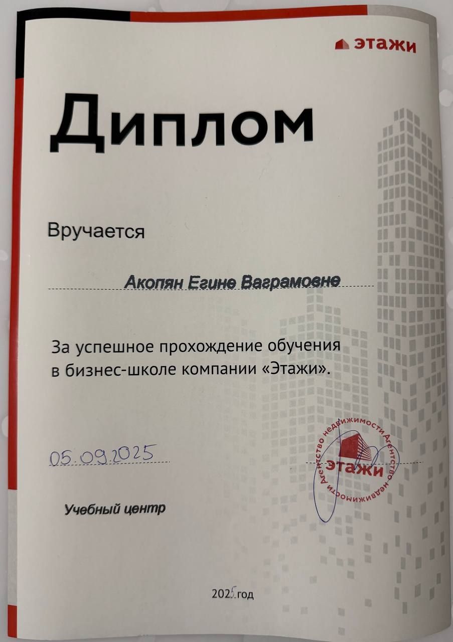 Хочу выразить огромную благодарность своему риелтору, Егине Акопян, за профессионализм, терпение и внимательное отношение на всех этапах сделки! С самого первого знакомства Егине проявила себя как эксперт своего дела: ответила на все мои вопросы, подробно рассказала о каждом предложении, помогла разобраться в документах и учла все мои пожелания. Благодаря профессионализму и поддержке Егине...