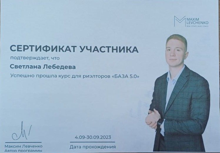 Хочу отметить прекрасную работу Светланы Владимировны и поблагодарить за помощь в покупке квартиры. Рекомендую как надежного и грамотного специалиста, учитывающего все нюансы, пожелания и интересы обеих сторон. В нашей сделке Светлана Владимировна участвовала со стороны продавца. Желаю успехов и процветания!