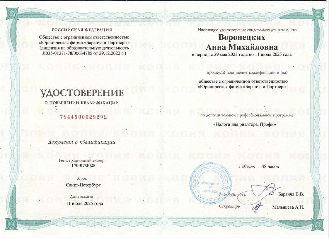 Настоящий квалифицированный профессионал, грамотно консультировала по всем возникающим вопросам при выборе объекта и совершении сделки, быстро и качественно решила все возникающие вопросы на всех этапах работы несмотря на разницу во времени, клиентоориентирована, обеспечила заключение сделки на выходных для меня условиях в сжатые сроки. В своем деле абсолютно компетентна, в документах легко...