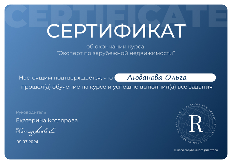 Риэлтор-брокер, стаж более 20 лет в недвижимости,эксперт на Российском и зарубежном рынках недвижимости; ипотечное кредитование на выгодных для вас условиях, выбор объекта, продажа со мной будут быстрей, надёжней и выгодней. Честность, ответственность- мои основные принципы работы.Станьте моим клиентом, получайте скидку со второго договора на услуги 5%, зарабатывай на рекомендациях.