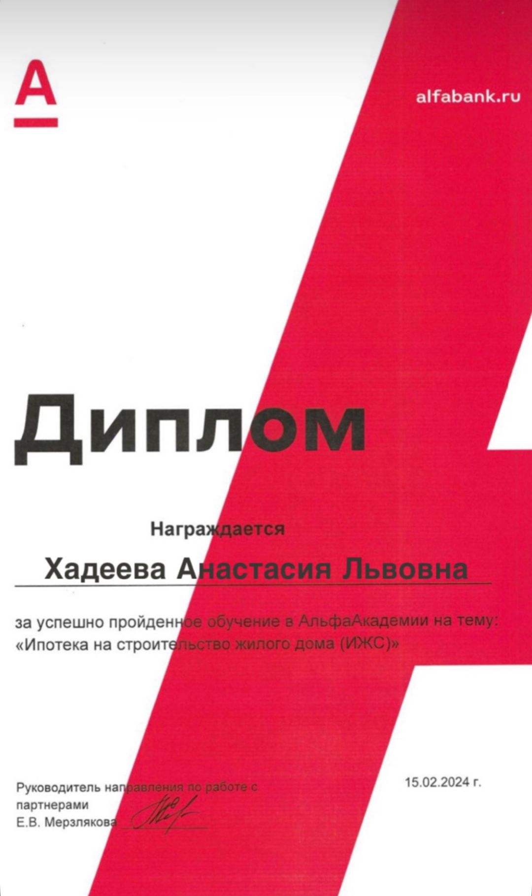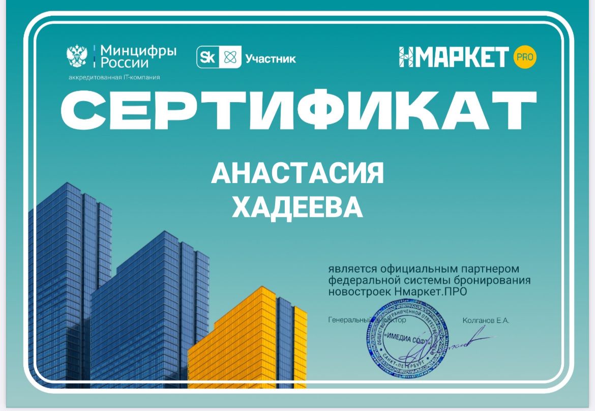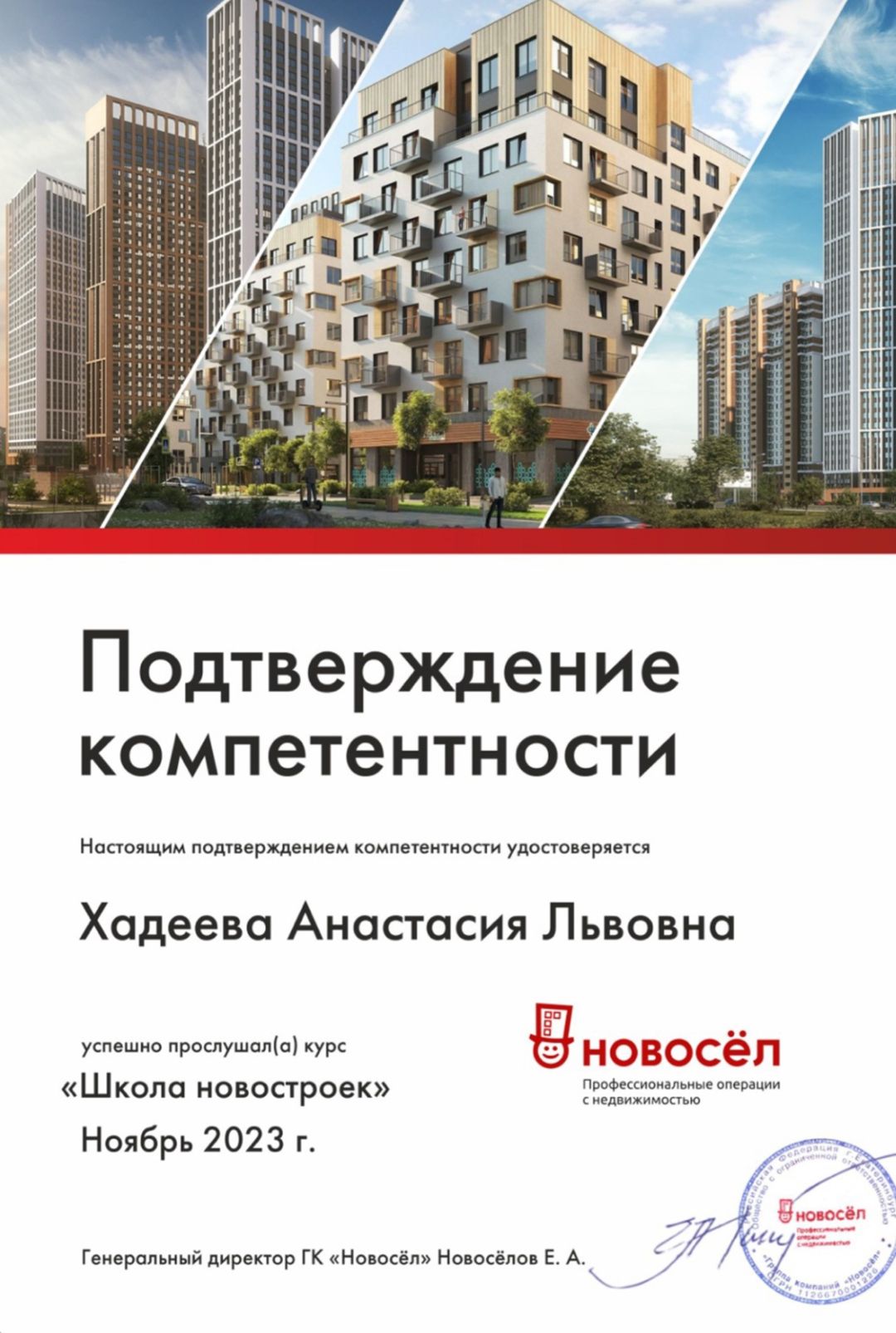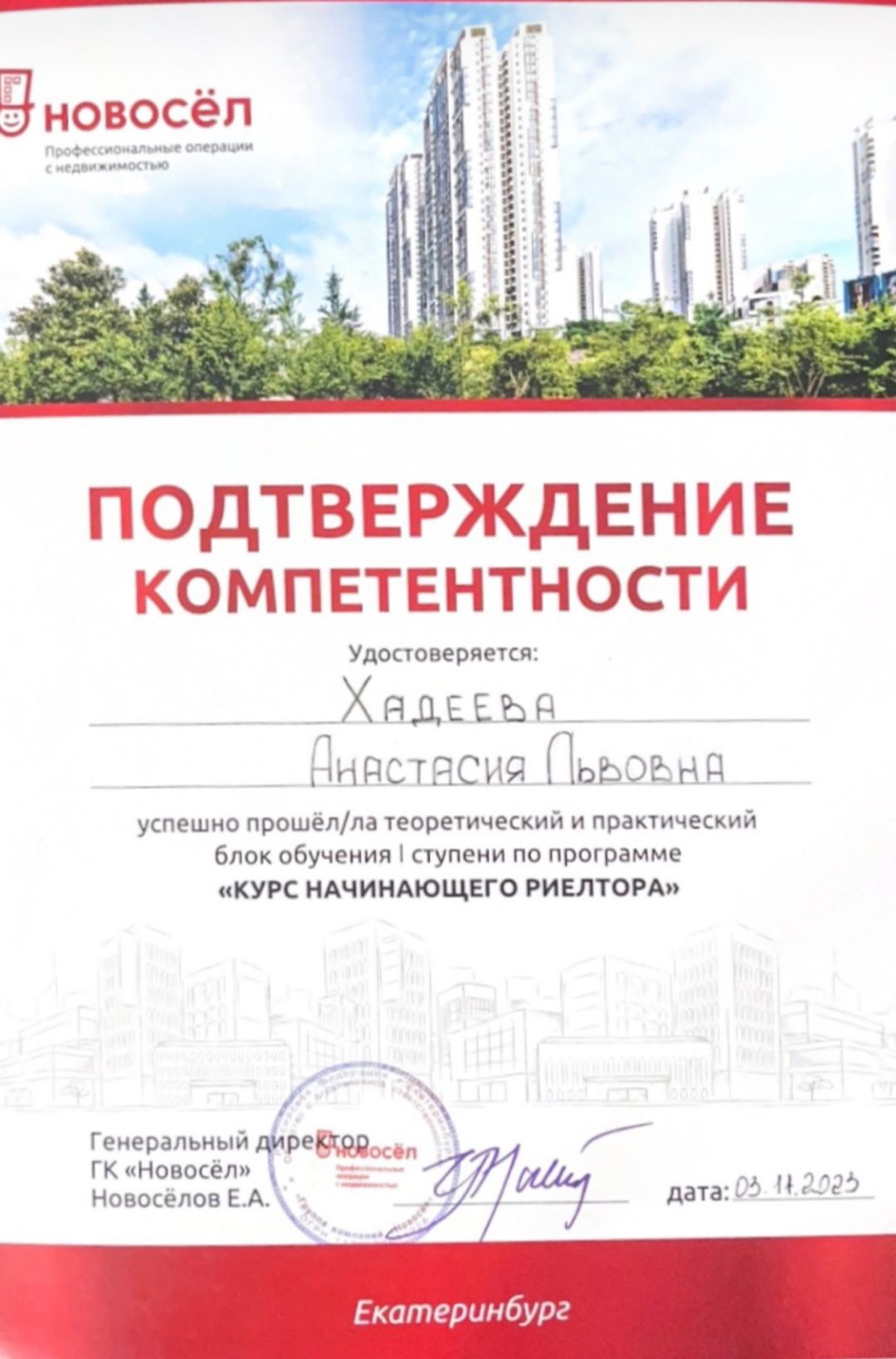 Очень благодарна риелтору Хадеевой Анастасии в помощи покупки квартиры. Быстро подготовила документы и оперативно вышли на сделку . Хорошая компания, отличный риелтор и просто замечательный человек) Спасибо огромное, при необходимости обратимся ещё!