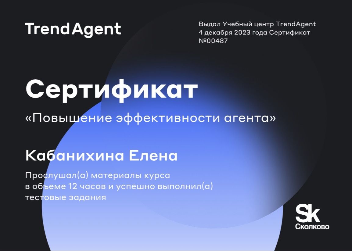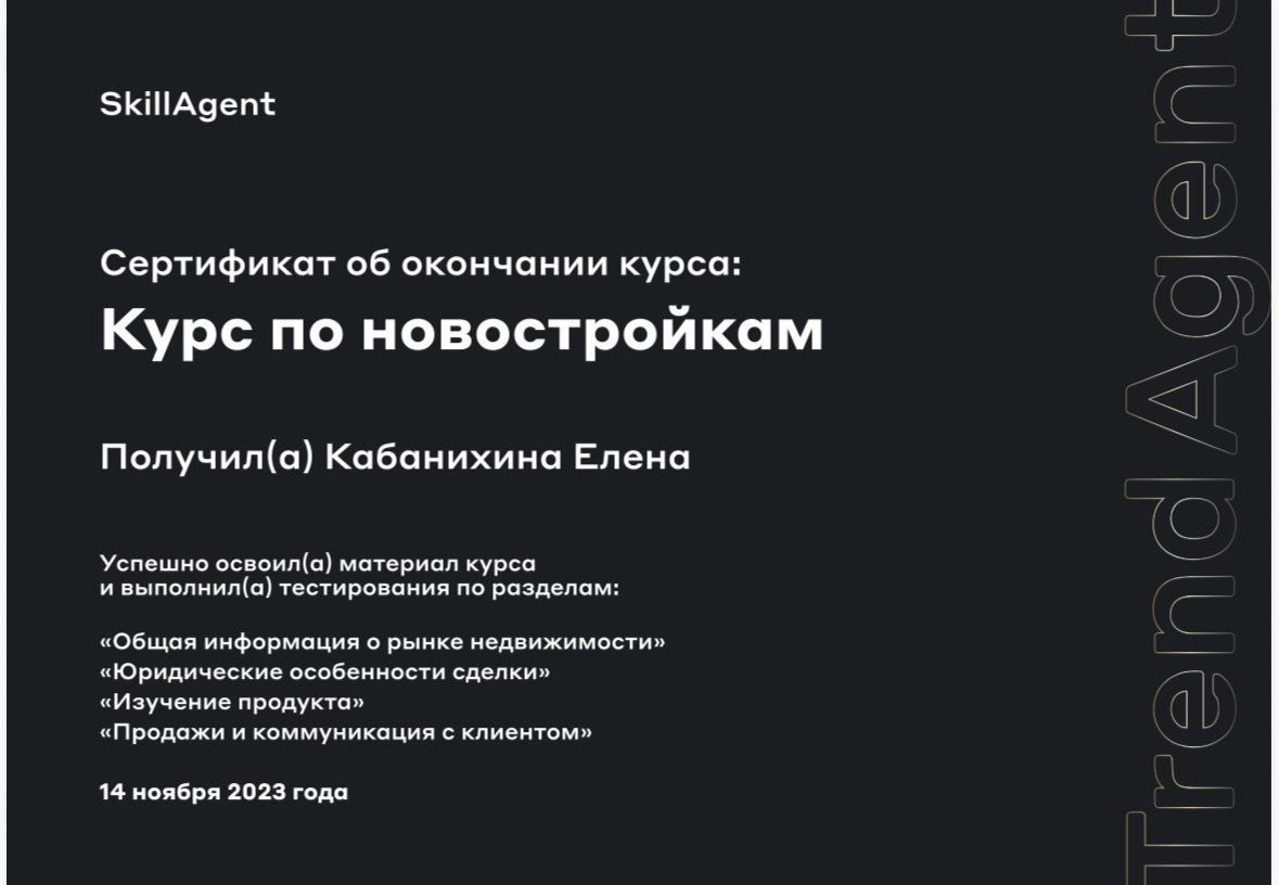 Выражаю огромную благодарность, Елене за профессиональную, комфортную помощь в покупке квартиры. Елена всегда была на связи, оперативно отвечала на все интересующие вопросы, что создавало дополнительный комфорт, полную поддержку и уверенности сделки. Настоящий профессионал своего дела. Рекомендую, Елену.
