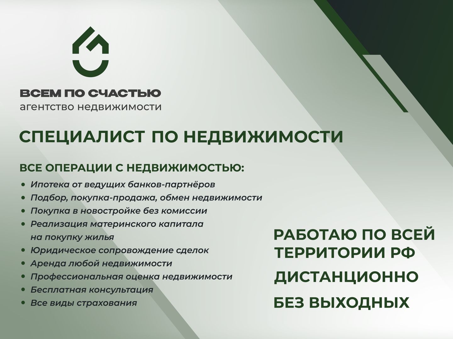 - поиск и подбор объектов жилой и коммерческой недвижимости