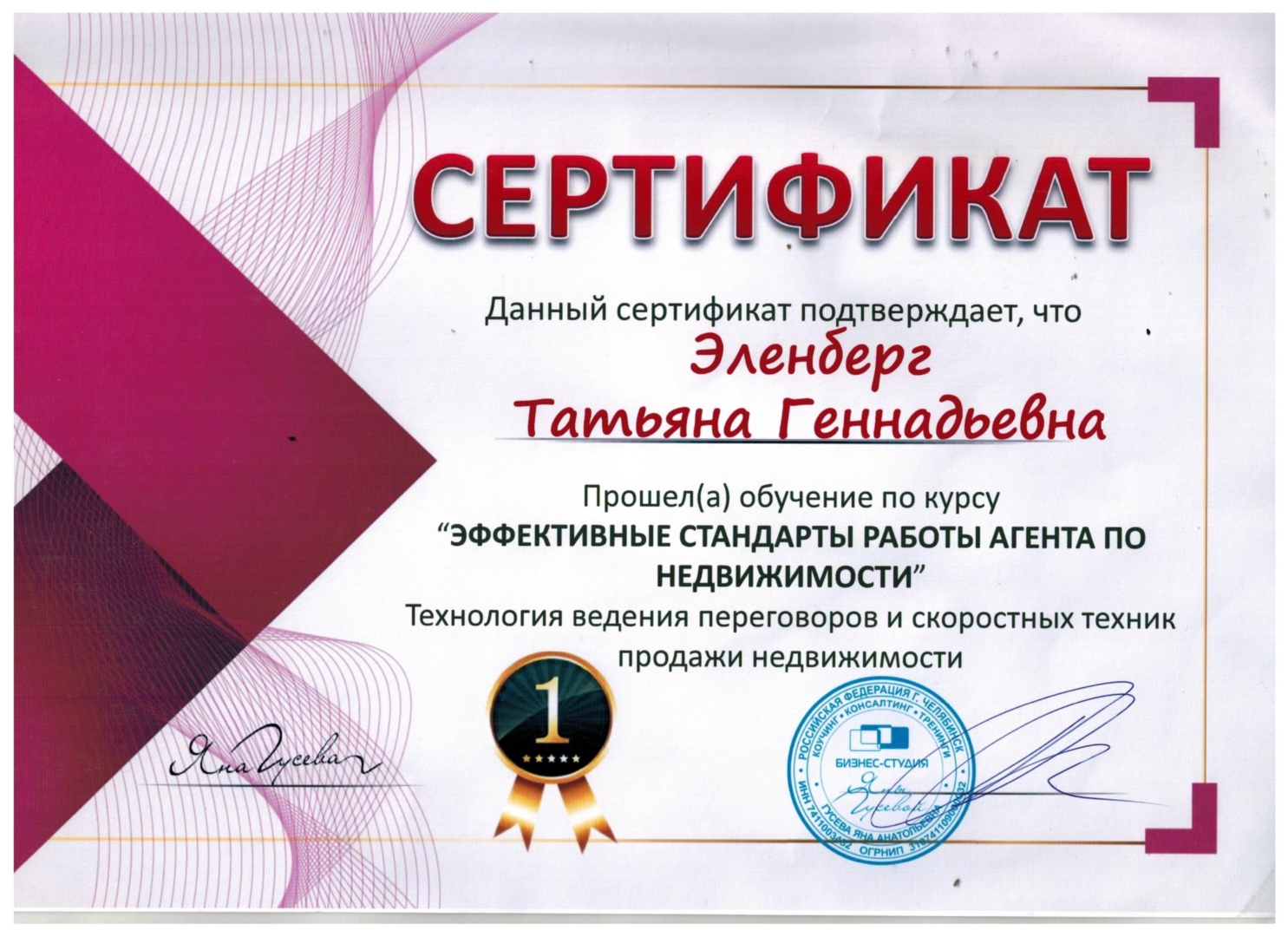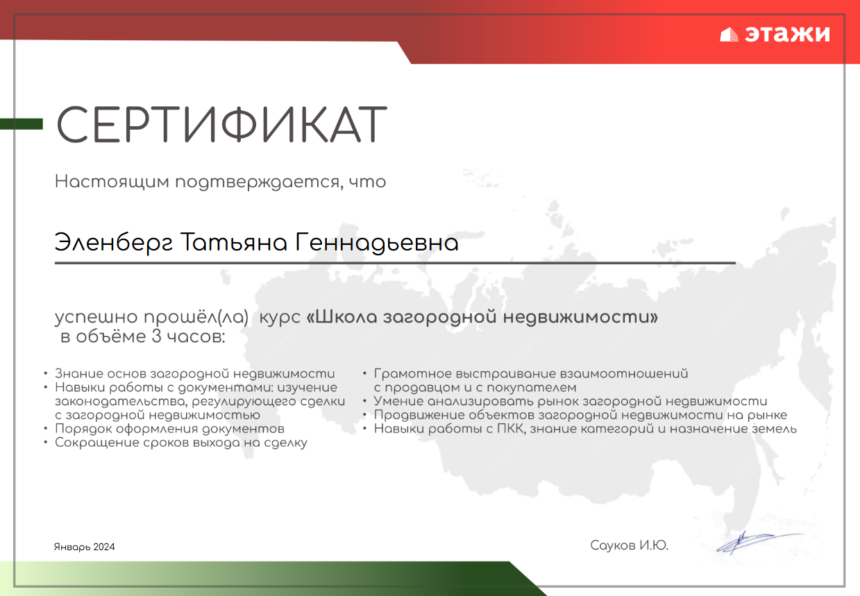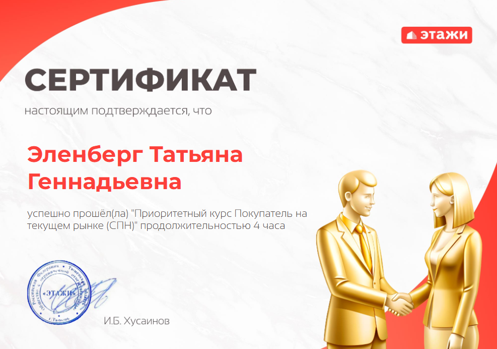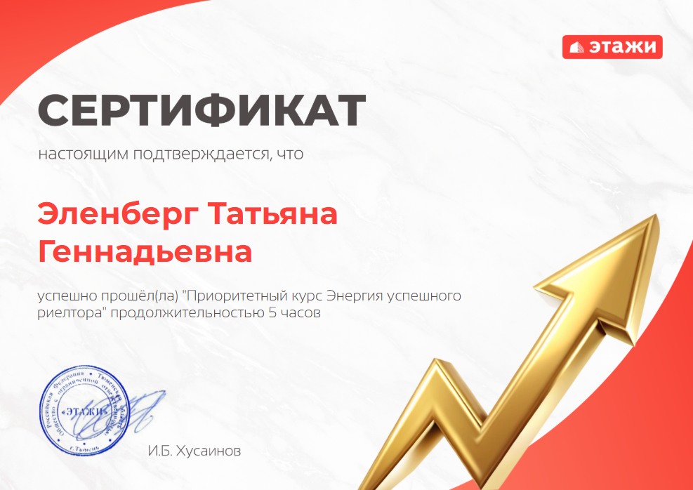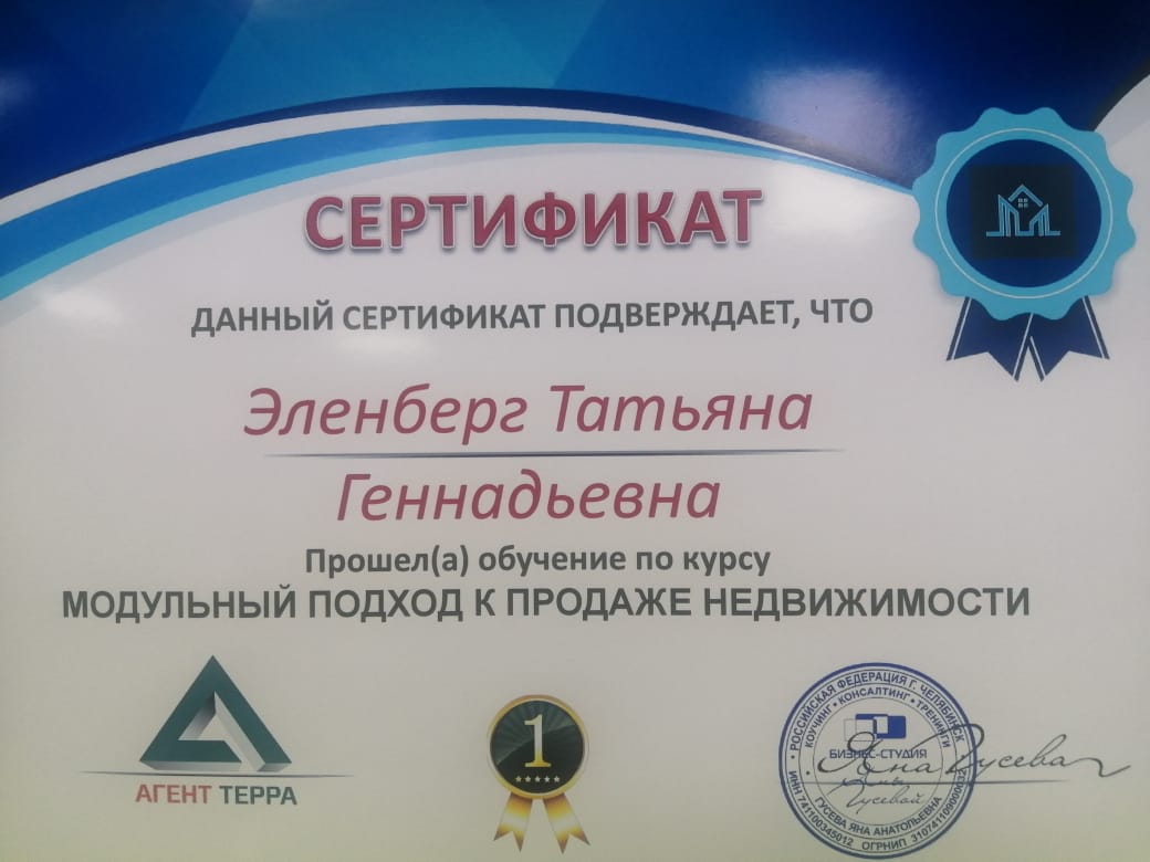 Обратилась к Эленберг Татьяне Геннадьевне по вопросу продажи квартиры и поиска потенциальных покупателей. Я благодарна ей за добросовестную, быстро проделанную работу, а также грамотную юридическую работу в ведении дела и подготовке документов. Все документы Татьяна подготовила к назначенному дню. Сделка состоялась быстро, спокойно и без каких-либо проблем. С удовольствием буду рекомендовать...