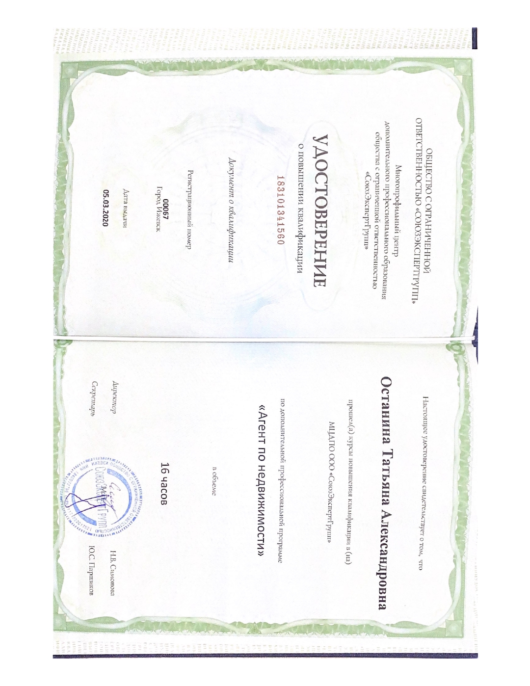 Я очень довольна своим риэлтором Останиной Татьяной Александровной. Очень добросовестный риэлтор, добродушный, вежливый,в каких то не понятных вопросах всегда подскажет, спасибо большое за терпение в работе со мной, буду рекомендовать знакомым этого риэлтора.