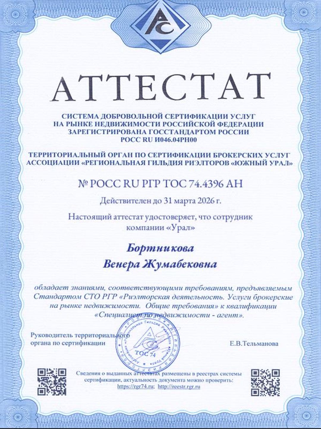 Здравствуйте! Меня зовут БОРТНИКОВА ВЕНЕРА. Я являюсь аттестованнвм специалистом и состою в региональной гильдии риэлторов. Для работы в данной сфере у меня есть много преимуществ: два высших образования, опыт работы в различных профессиональных сферах, а также пунктуальность, ответственность. Мой девиз: "Упорный труд открывает путь к успеху "