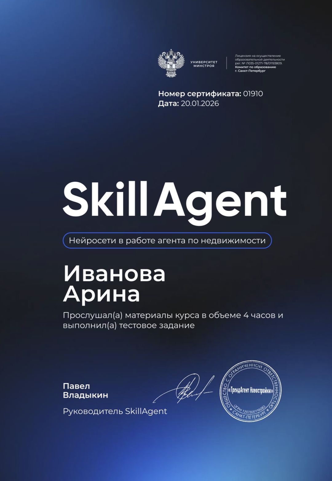 Выражаю огромную благодарность данному специалисту по недвижимости , уже не первая сделка по счету и всегда все супер . Арина очень ответственный , честный , приятный специалист , с кем одно удовольствие сотрудничать !