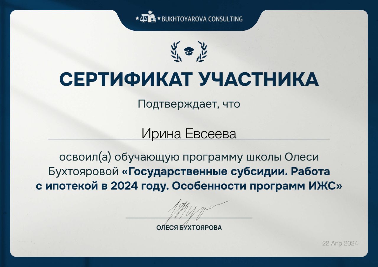 Хочу выразить огромную благодарность Евсеевой Ирине Васильевне. С ней мы легко продали квартиру и купили новую, хотя процесс казался очень сложным... Она всегда была на связи 24/7, отвечала на все вопросы и делала всё возможное, чтобы наша сделка прошла максимально безопасно и быстро. Ирина - настоящий профессионал своего дела, юридически грамотна, доброжелательна, отзывчива и умеет находить...