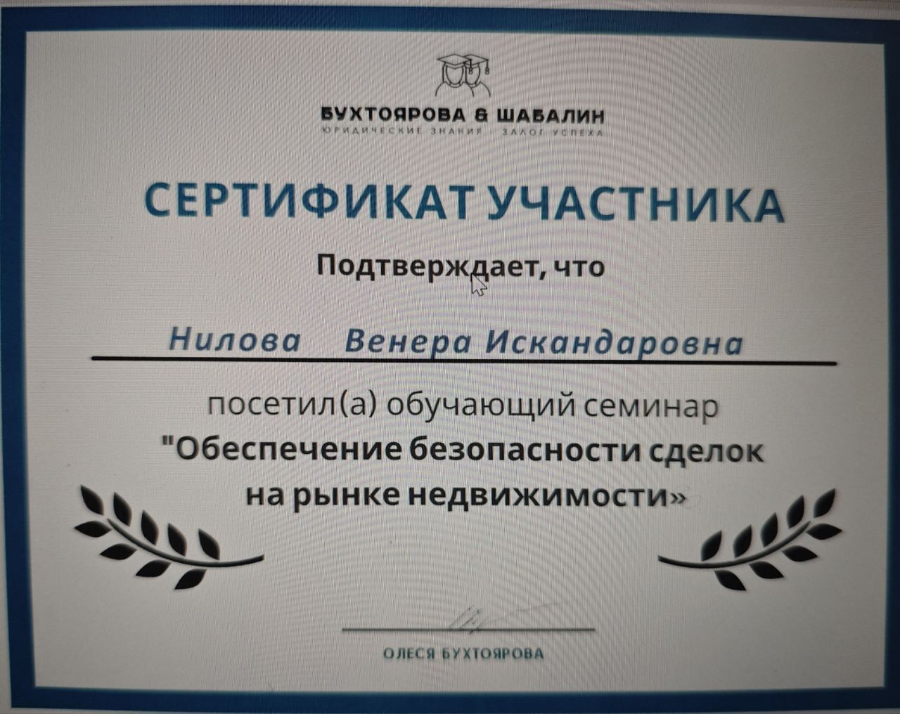 Хочу выразить благодарность риелтору Венере Искандаровне, продал с её помощью квартиру.Очень быстрая и слаженная работа за короткий срок.Она всегда компетентна и доброжелательна, создаст комфорт и ускорит сделку.Большое спасибо, советую всем!