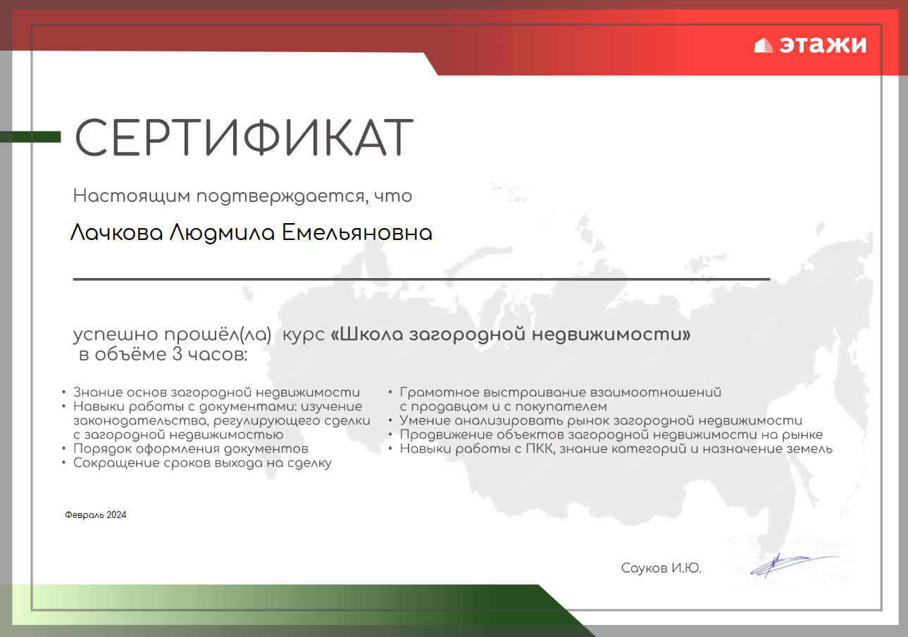Наша огромная благодарность Лачковой Людмиле за помощь в сопровождении сделки по покупке квартиры, получении ипотеки, страховании. Людмила очень профессиональный и ответственный специалист, порядочный и добросовестный человек. В любое время отвечала на все мои вопросы и поддерживала меня на протяжении всей сделки. Желаю Людмиле много клиентов, удачи и добра. Буду рекомендовать Людмилу как лучшего...