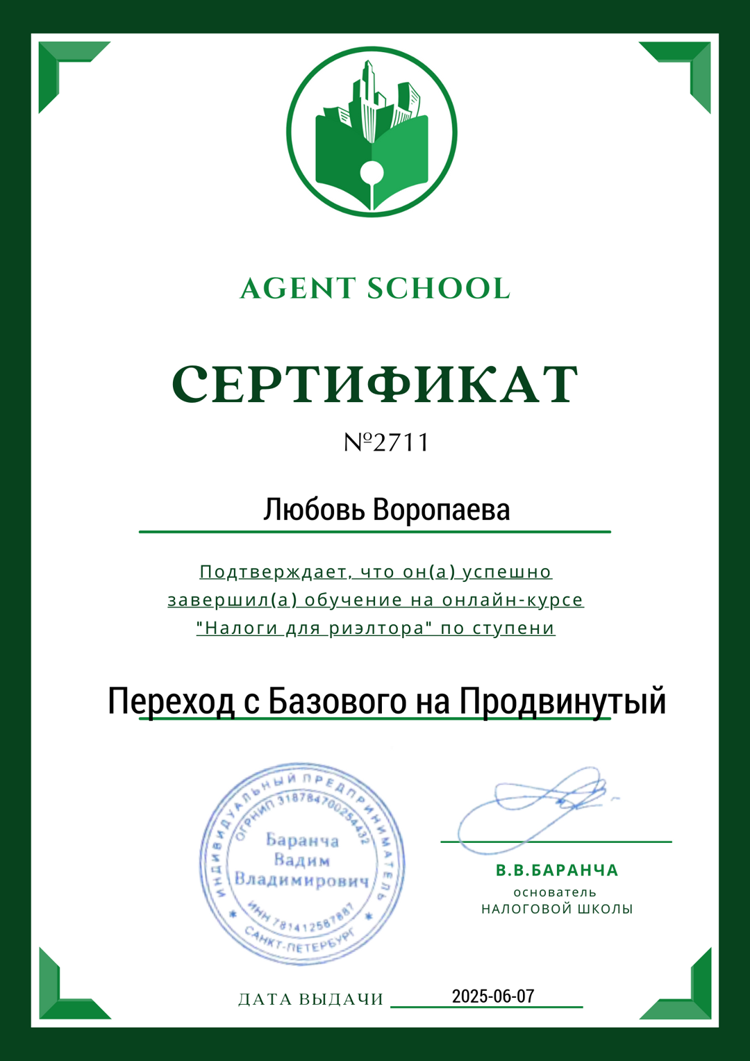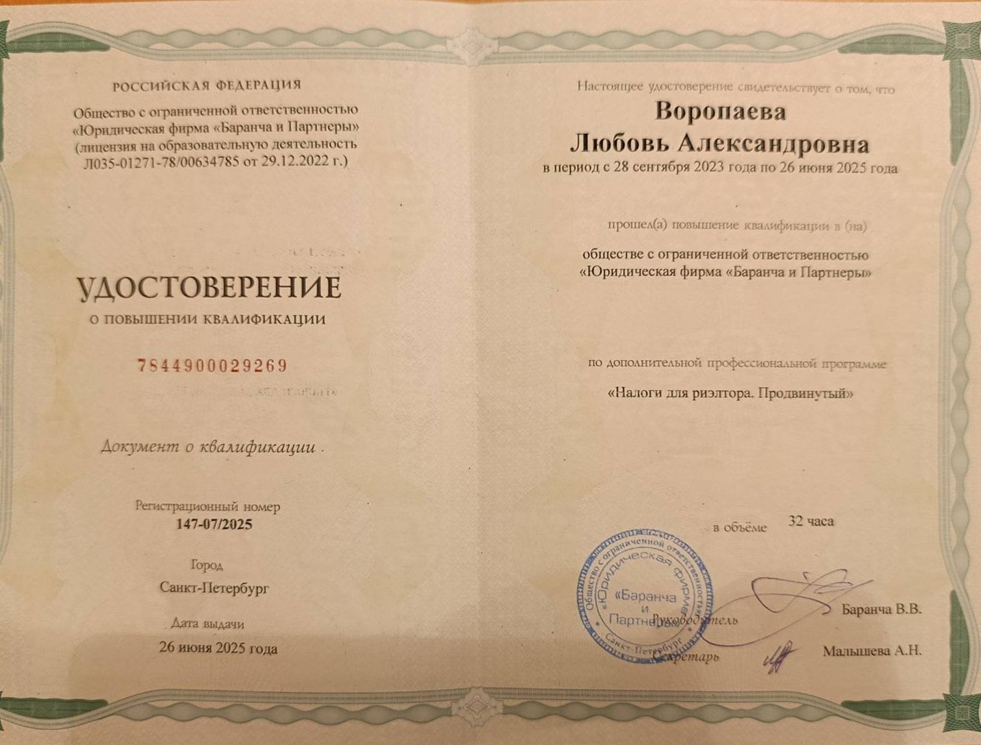 Благодарим Любовь Александровну за грамотное юридическое сопровождение нашей сделки. Очень приятно было с ней работать. Если было бы можно, поставили бы "сто баллов".