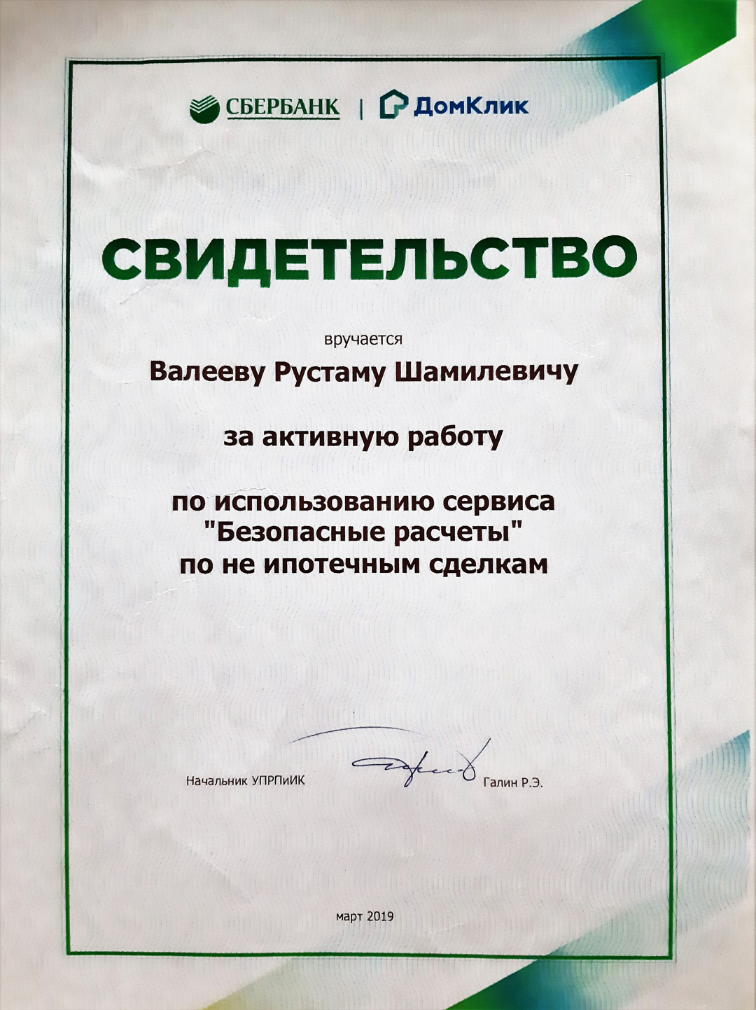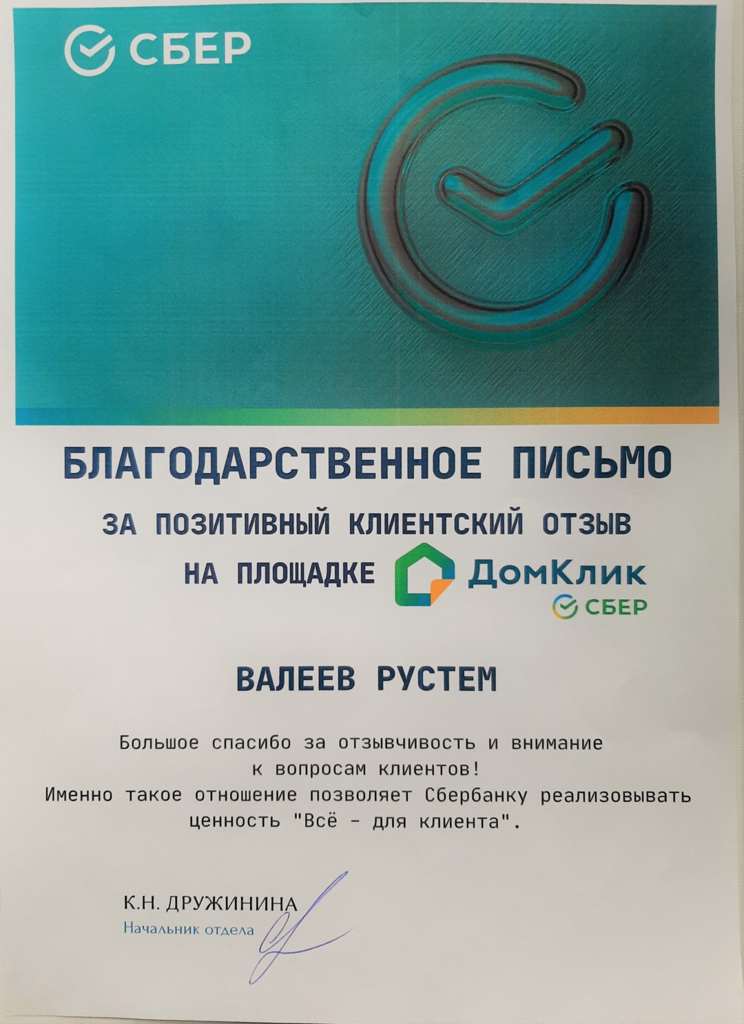 Выражаем огромную благодарность Валееву Рустему Шамилевичу за помощь при выборе квартиры и отлично проведенную сделку. Рустем Шамилевич очень грамотный специалист, профессионал своего дела, приятный и отзывчивый человек. Благодаря его советам, опыту, профессионализму выбрали хороший вариант по устраивающей нас цене. Рекомендую обращаться !