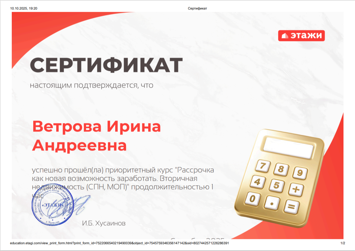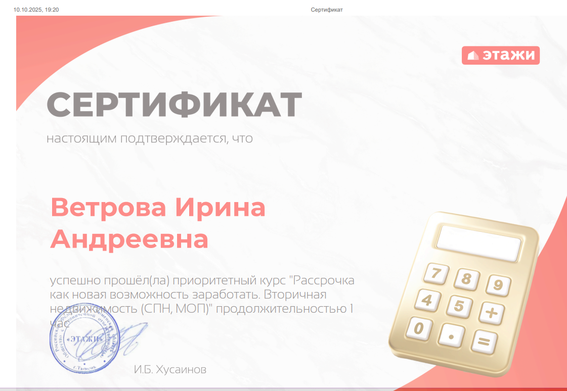 Никогда не думала, что покупка квартиры в новостройке может быть такой… кайфовой! Ветрова Ирина Андреевна из “Этажей” (г. Южно-Сахалинск) - настоящий гуру недвижимости и мастер дистанционного общения! Что меня поразило: Скорость - просто космическая! Будто квартиру в магазине купила, только вкуснее 🍪 Грамотность на высшем уровне - все четко, по полочкам, без воды! Дистанционно? Да легко! Как...