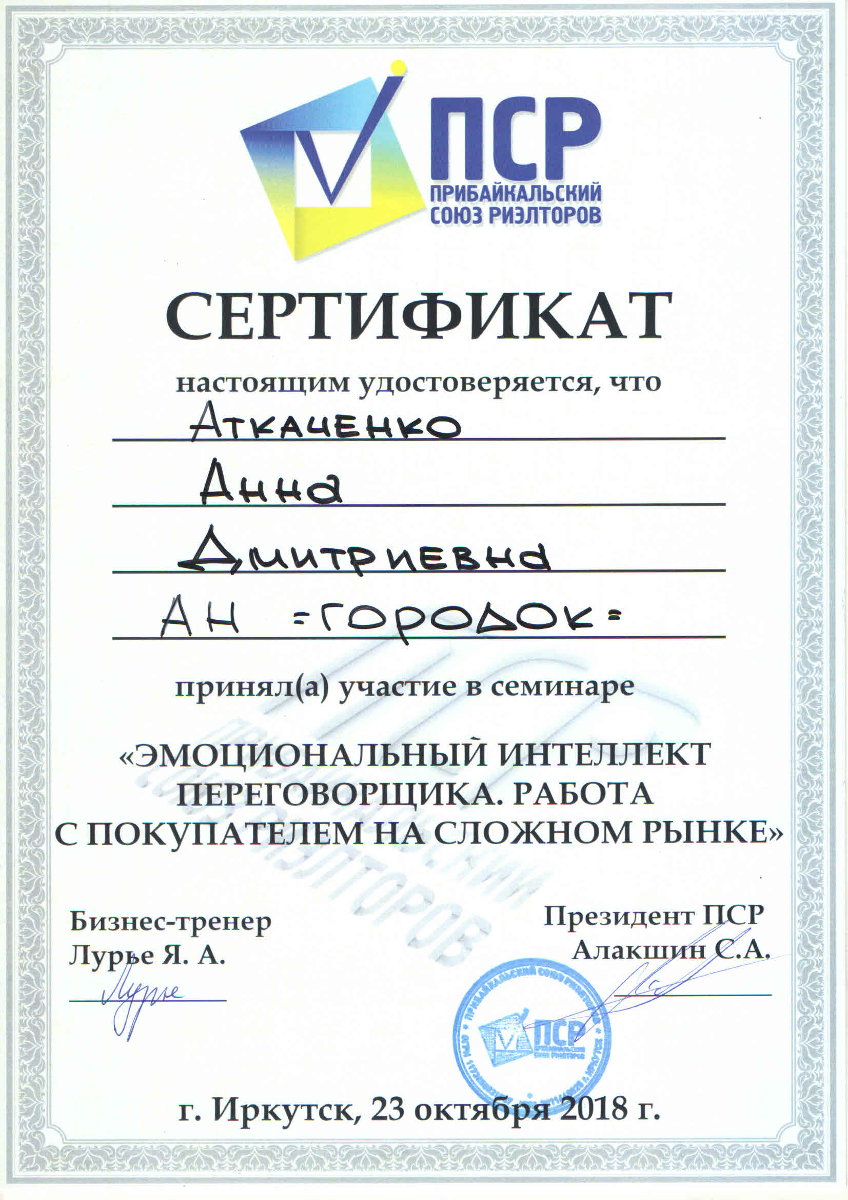 Я — сотрудник АН -ГОРОДОК- г. Иркутск, занимаюсь операциями с недвижимостью продажей и покупкой, в интересах своих Клиентов, по законам РФ с 2018 года. Теоретические знания риэлторской деятельности, с подтверждением аттестатов и сертификатов, в обязательном порядке, прохожу вместе с коллегами, два раза в год. Ясность и определенность действий при оказании услуг,оперативное начало работы,...