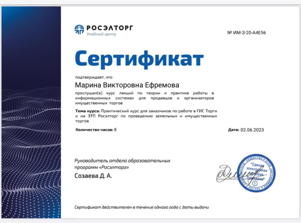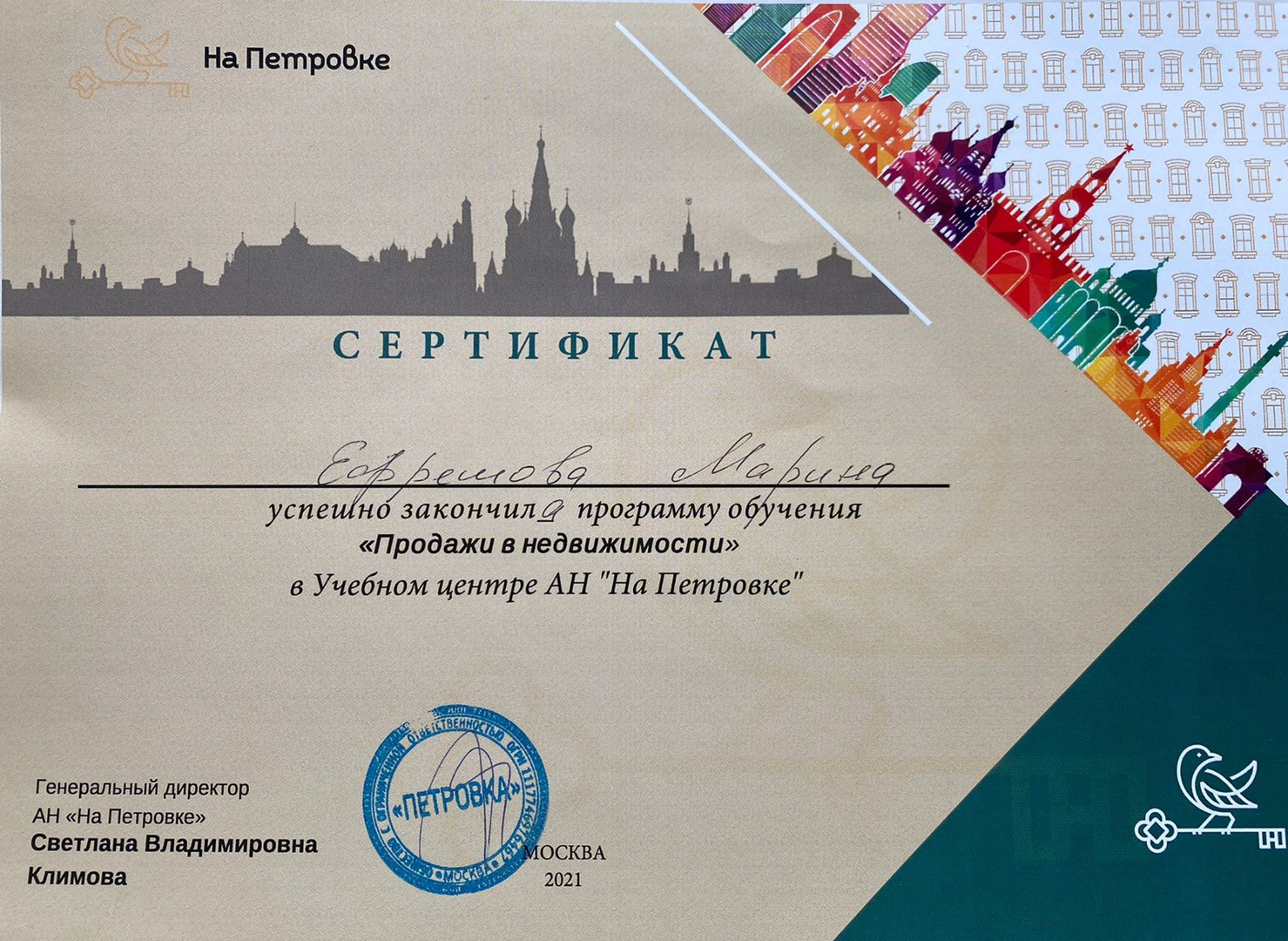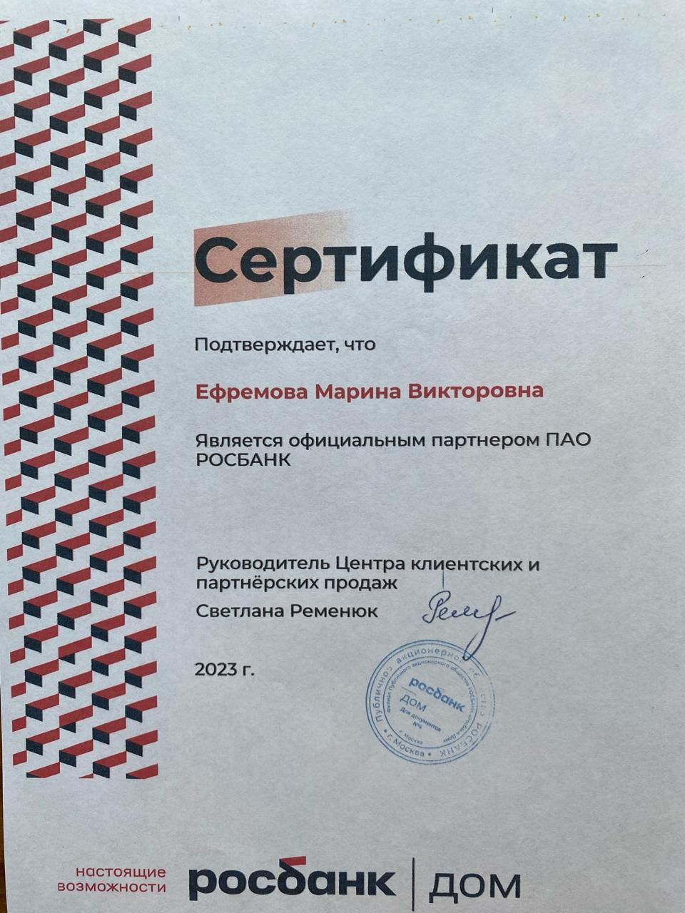 Хочу выразить благодарность риэлтору Марине Ефремовой, за ее профессиональную работу в участии в торгах в марте на аукционе по покупке квартиры от Фонда реновации, с дальнейшим полным сопровождением, так как торги, Марина, выиграла для нас. Огромное спасибо за помощь в оформлении всех сопутствующих документов, оформление ипотеки, за грамотное и четкое проведение всех этапов покупки квартиры, от...