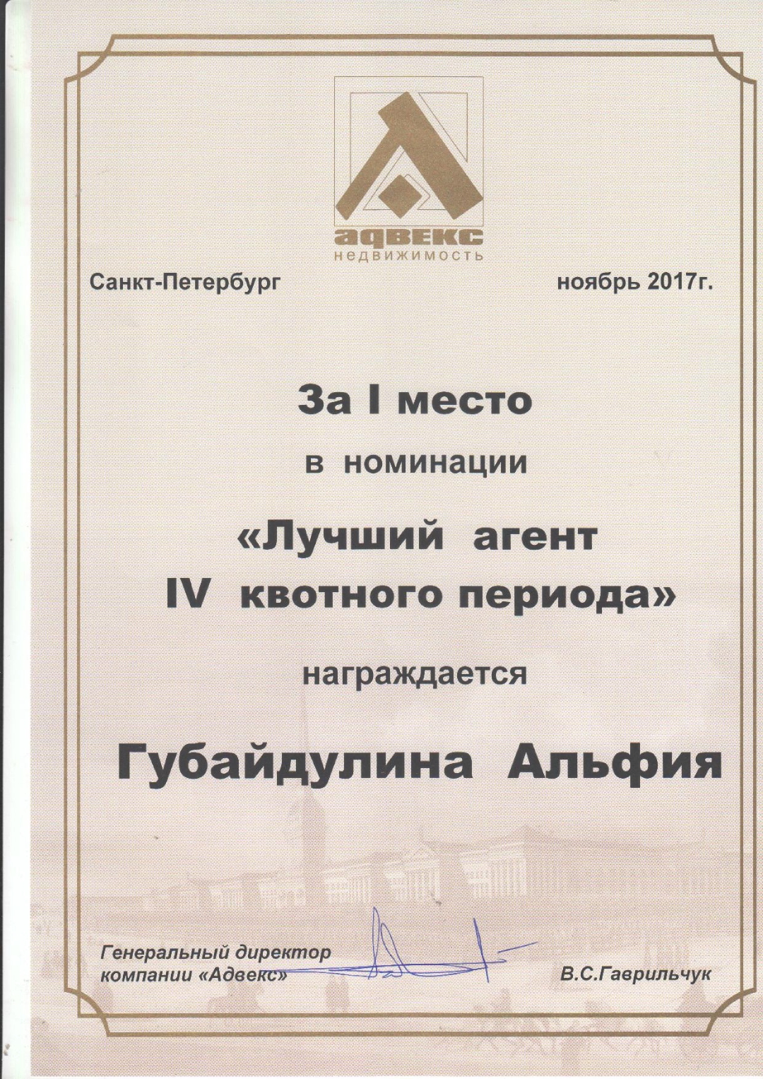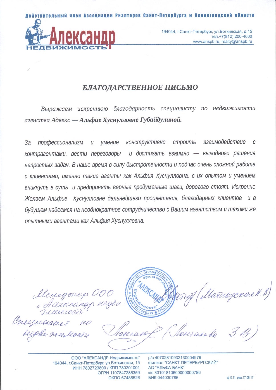 Выражаю огромную благодарность Губайдулиной Альфие за высокий профессионализм, качественную работу , оперативность и полное сопровождение сделки! В процессе работы все вопросы решались быстро и качественно. Отдельная благодарность за помощь в выборе объекта, ответственность и индивидуальный подход.