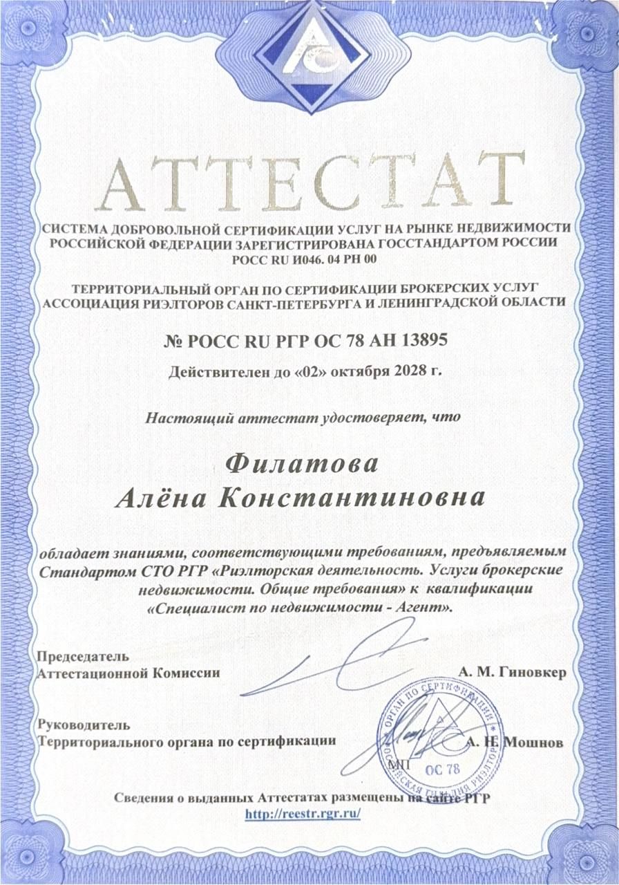 Хочу оставить отзыв и выразить благодарность Филатовой Алене Константиновне, риэлтору РФН, за проделанную работу и помощь в поиске и покупки квартиры на вторичном рынке. Поиск, одобрение ипотеки, общение с продавцом, сама сделка - на всех этапах Алена помогала и решала все возникающие вопросы и моменты. Искренне рекомендую и говорю СПАСИБО! С ней была уверенность что все пройдет хорошо, правильно...