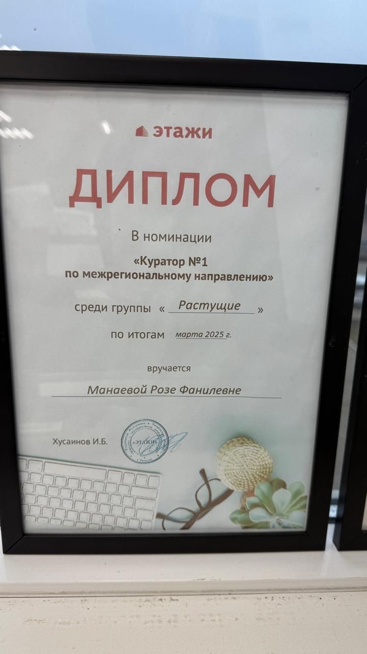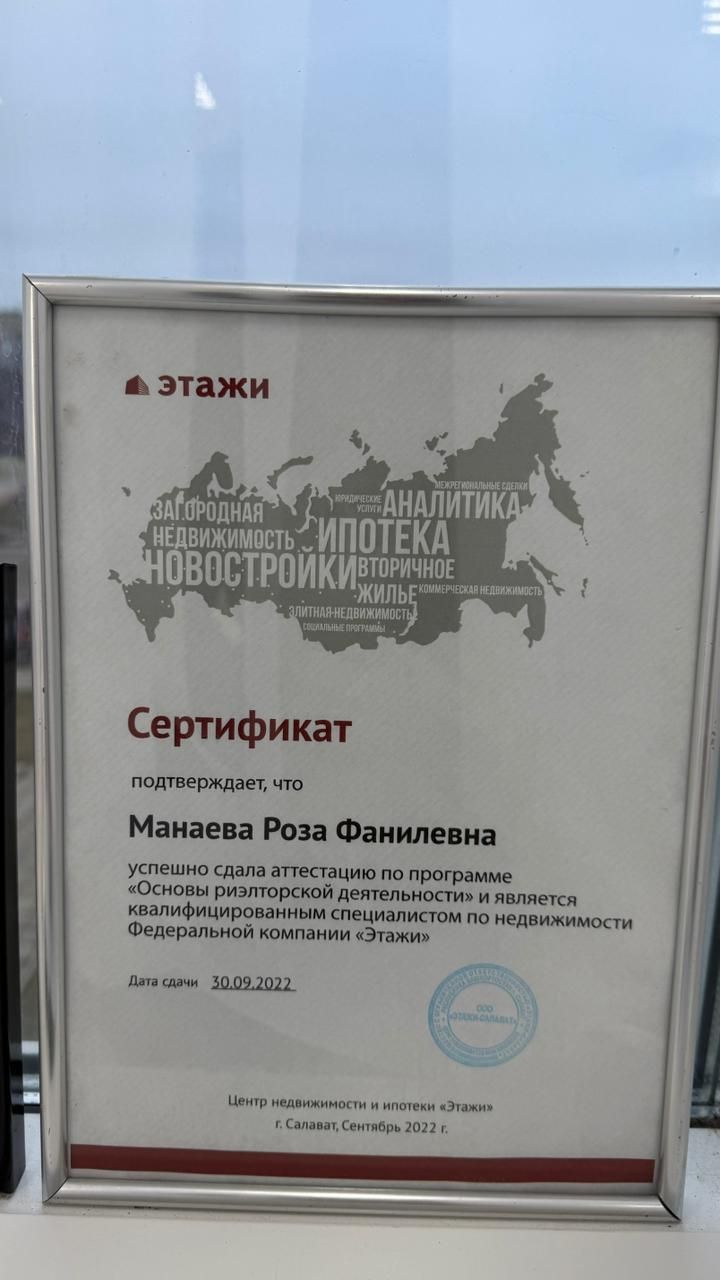 Здравствуйте! Я Роза, эксперт по недвижимости компании «Этажи». Помогаю покупать и продавать с максимальной выгодой: ✅ Снижу ипотечную ставку через 20+ банков-партнеров ✅ Гарантирую безопасные расчеты и юридическую чистоту ✅ Провожу онлайн-сделки между регионами Экономлю ваши деньги, время и нервы! Проконсультирую бесплатно.