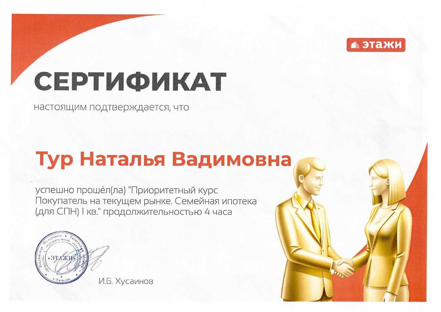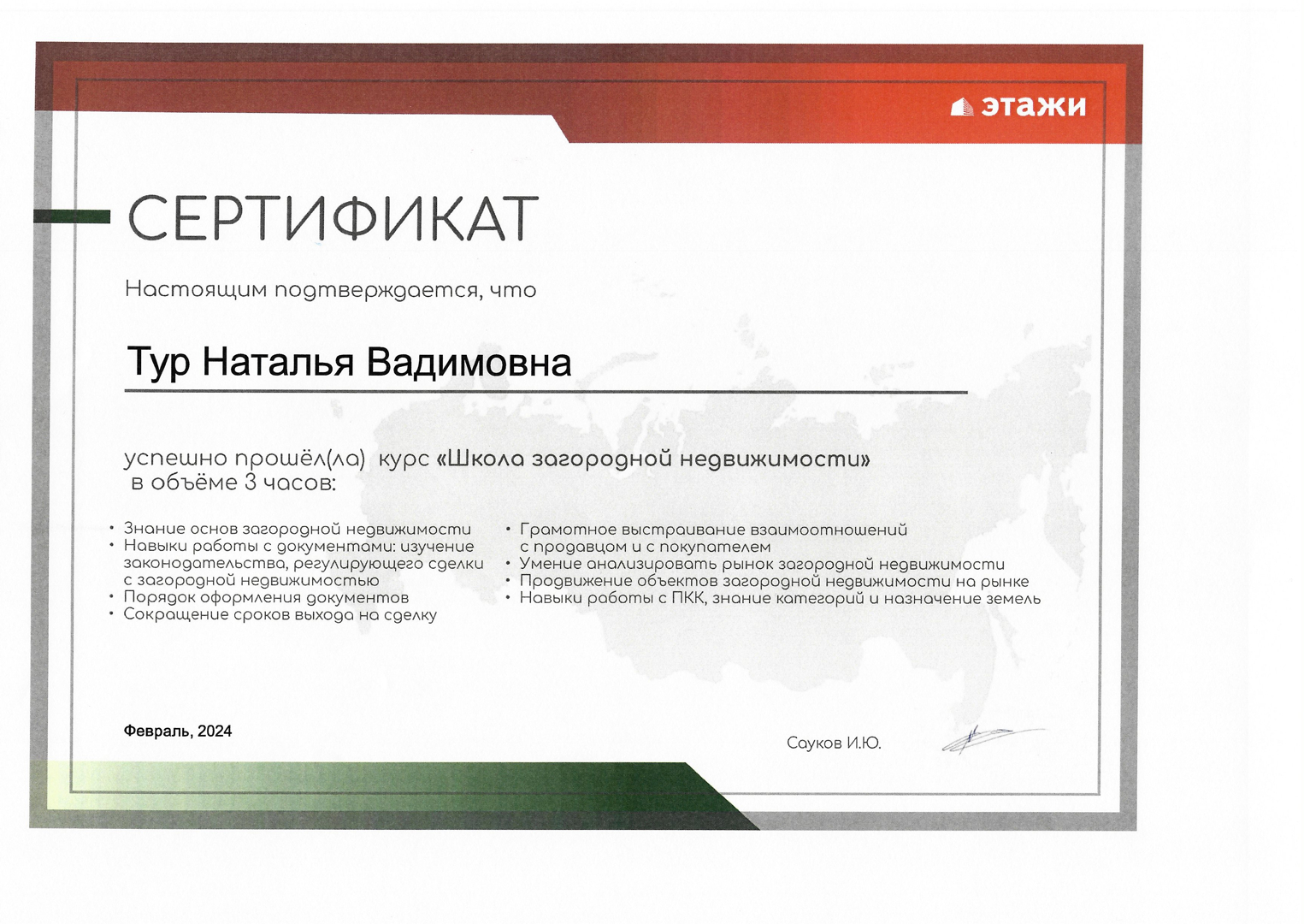 Хочу поблагодарить Наталью Тур за сопровождение и проведение межрегиональной сделки по продаже квартиры в г. Южно-Сахалинске. Продавец, покупатель и квартира находились в разных городах, сделка была полностью проведена дистанционно. Были организованы показы и формирование пакета документов для Домклик. Все прошло хорошо, сделка прошла 24 декабря 2024 года.