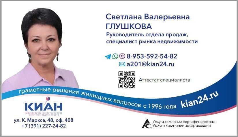 Красноярское Инвестиционное Агентство Недвижимости «КИАН» Лучшая брокерская компания на рынке продажи жилья 2024 по версии РГР; ТОП-10 агентств недвижимости г. Красноярска; 4 место в рейтинге Домклик по региону; С 1996 года аттестованные специалисты компании оказывают полный комплекс услуг на рынке недвижимости с выгодой для Вас. НАША ЦЕЛЬ – соблюдение законности проводимых операций,...
