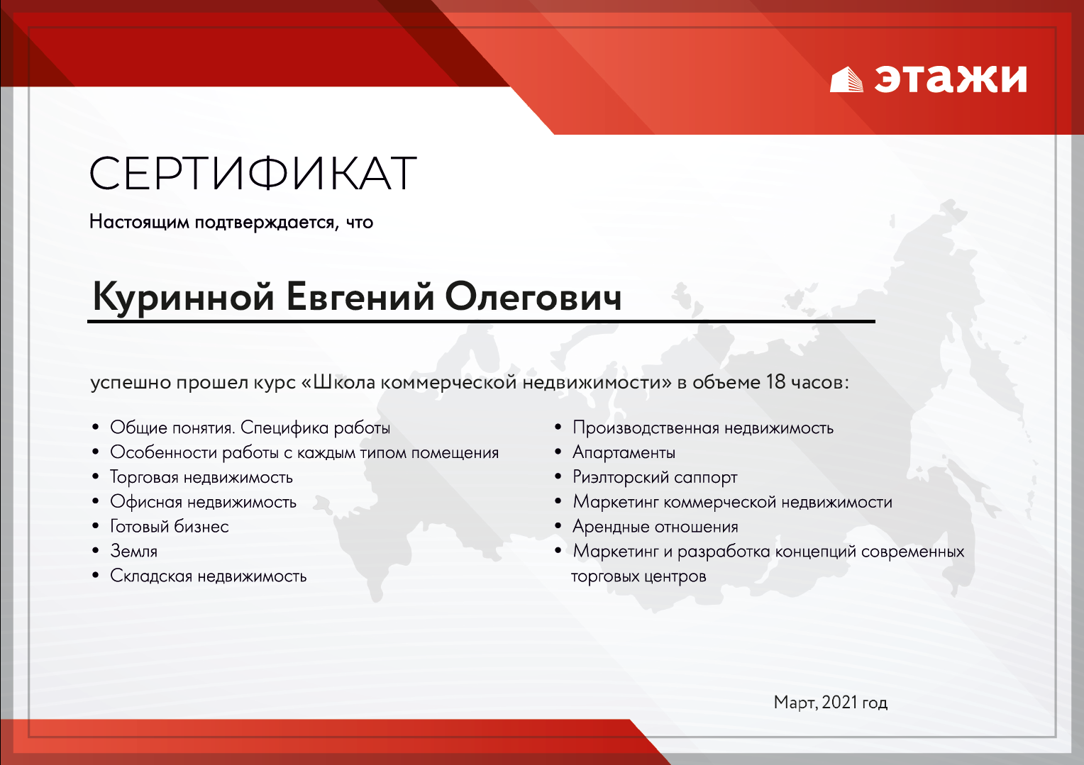 К Евгению обратилась по рекомендациям знакомых, и хочу поблагодарить его за помощь в процессе купли-продажи земельного участка и сопровождении ипотечной сделки на строительство дома. Евгений активно помогал с начала и до завершения сделок, проявил высокий уровень компетенции, грамотно и оперативно проводил все этапы. Большое спасибо за Вашу работу, Евгений! Очень рекомендую Куринного Евгения...
